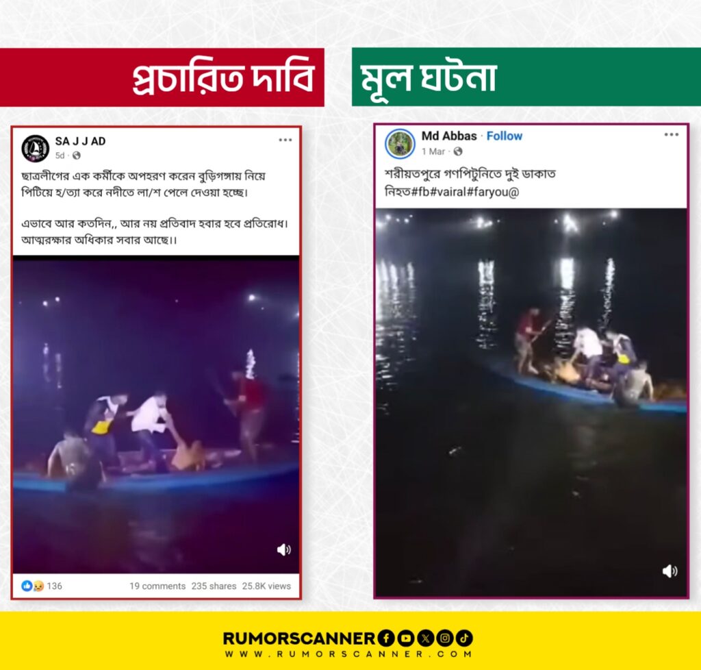 রিউমর স্ক্যানার টিমের অনুসন্ধানে জানা যায়, প্রচারিত ভিডিওটি নিষিদ্ধ সংগঠন ছাত্রলীগের কর্মীকে অপহরণের পর পিটিয়ে হত্যা করে লাশ বুড়িগঙ্গা নদীতে ফেলে দেওয়ার দৃশ্য নয়। প্রকৃতপক্ষে, গত ২৮ ফেব্রুয়ারি দিবাগত রাতে শরীয়তপুরের কীর্তিনাশা নদীর তীরে ডাকাতি করে পালিয়ে যাওয়ার সময় ডাকাত দলকে ধরে গণধোলাই দেয় স্থানীয় লোকজন। উক্ত ঘটনার ভিডিও এটি।