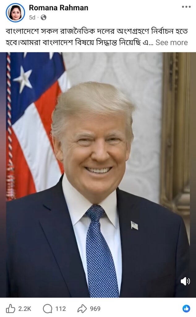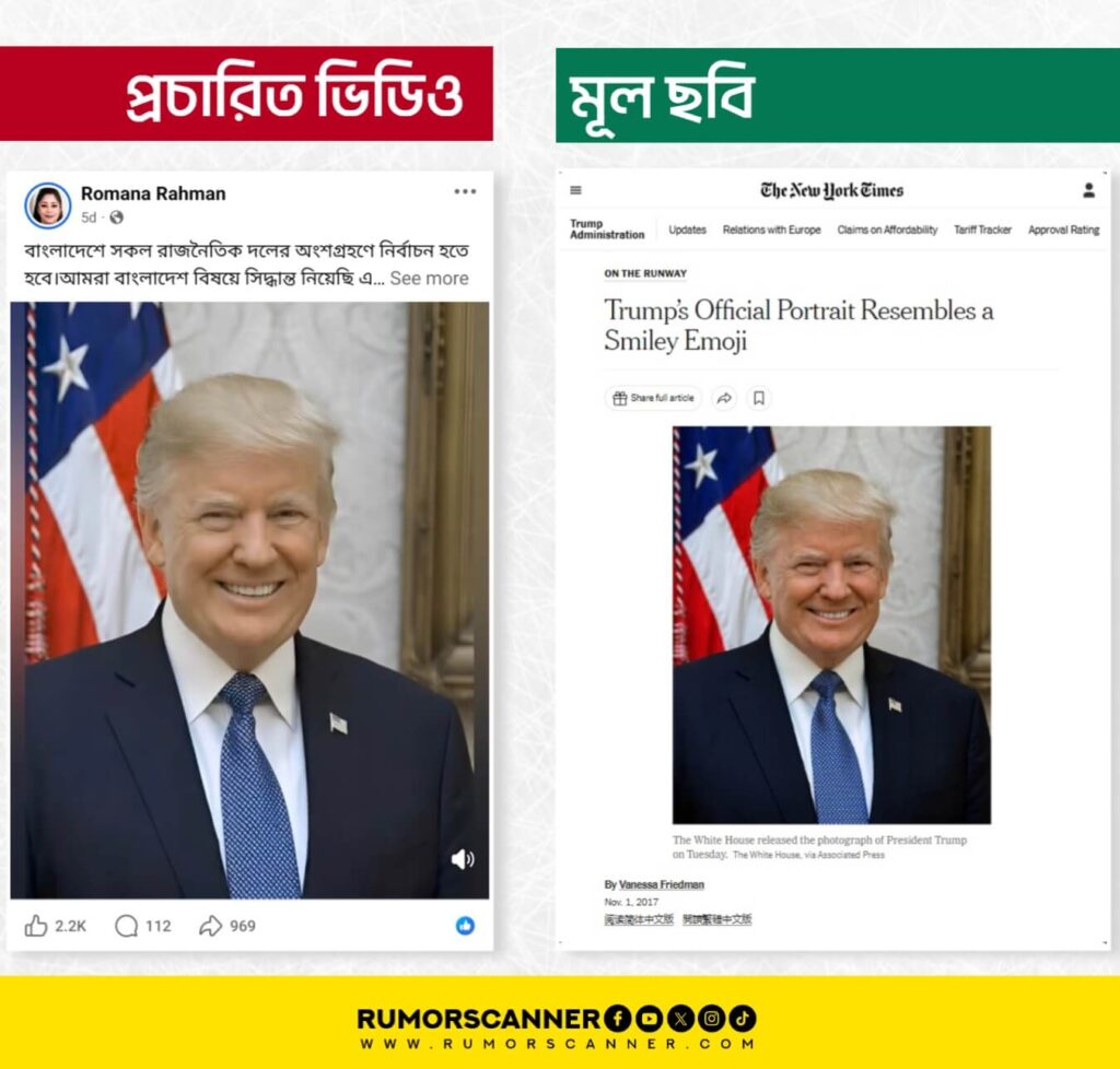 রিউমর স্ক্যানার টিমের অনুসন্ধানে জানা যায়, বাংলাদেশের আসন্ন নির্বাচন নিয়ে যুক্তরাষ্ট্রের প্রেসিডেন্ট ডোনাল্ড ট্রাম্পের মন্তব্য দাবিতে প্রচারিত ভিডিওটি বাস্তব নয়। প্রকৃতপক্ষে, তার একটি ছবি ব্যবহার করে কৃত্রিম বুদ্ধিমত্তা (এআই) প্রযুক্তির এর সহযোগিতায় আলোচিত ভিডিওটি তৈরি করে প্রচার করা হচ্ছে।