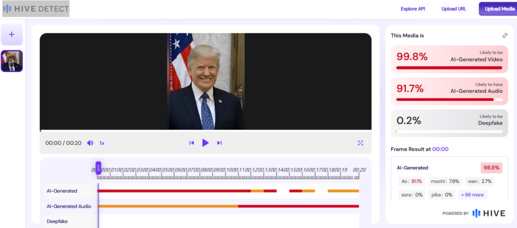 বিষয়টি অধিকতর যাচাইয়ের জন্য কৃত্রিম বুদ্ধিমত্তার সহায়তায় তৈরি কনটেন্ট শনাক্তকারী টুল ‘হাইভ ডিটেক্ট’ এ পরীক্ষা করে রিউমর স্ক্যানার। বিশ্লেষণে দেখা যায়, ভিডিওটি এআই দিয়ে তৈরি হওয়ার সম্ভাবনা ৯৯.৮ শতাংশ।