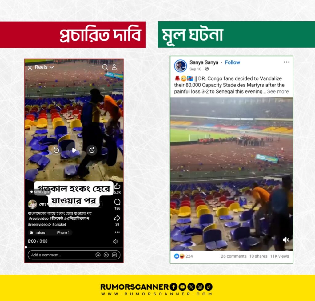 রিউমর স্ক্যানার টিমের অনুসন্ধানে জানা যায়, প্রচারিত ভিডিওটি হংকং এর সমর্থকদের নয়। প্রকৃতপক্ষে, সেনেগালের কাছে ৩-২ গোলে হারের পর বিশ্বকাপ বাছাইপর্বে ডিআর কঙ্গোর সমর্থকদের স্টেডিয়াম ভাঙচুরের ভিডিওকে উক্ত দাবিতে প্রচার করা হয়েছে।