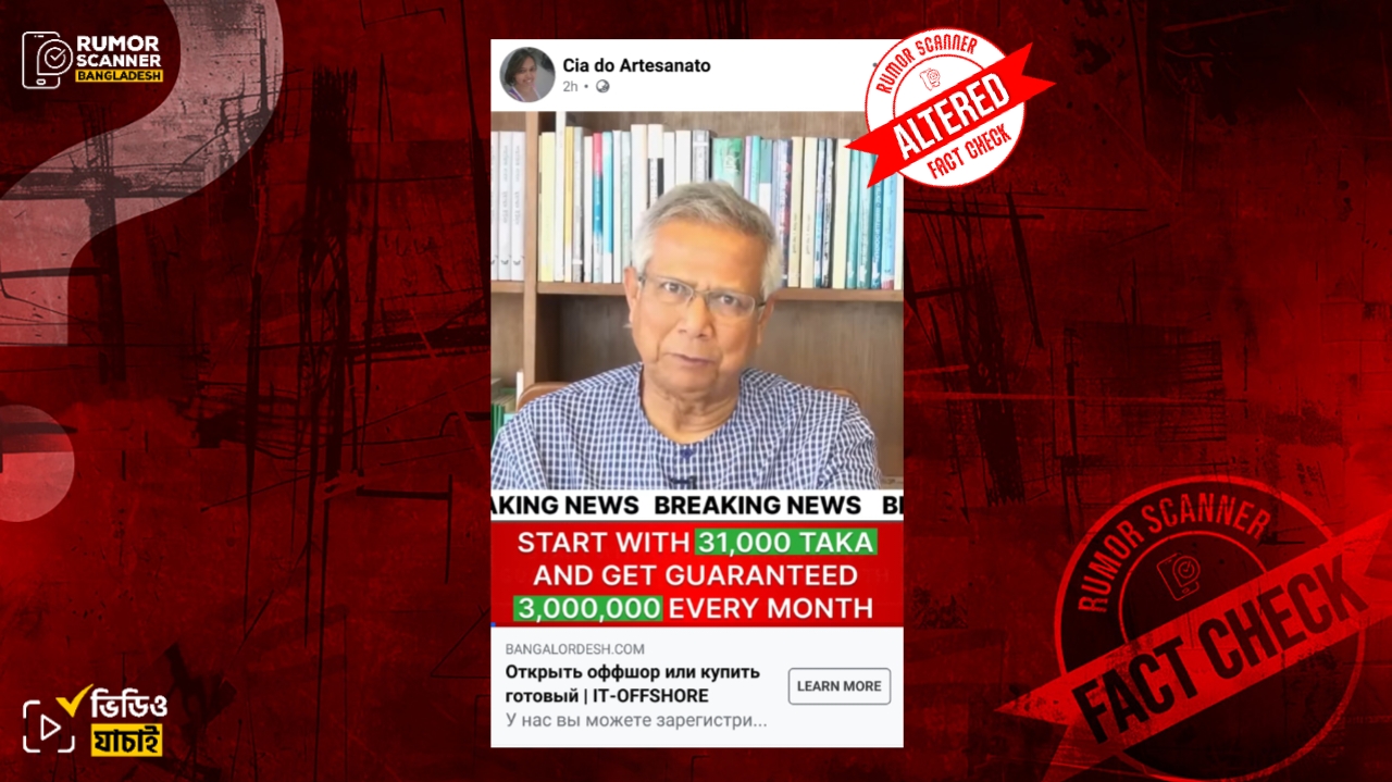 রিউমর স্ক্যানার টিমের অনুসন্ধানে জানা যায়, ড. মুহাম্মদ ইউনূস বাংলাদেশ ব্যাংকের মাসভিত্তিক লাভের কোনো বিনিয়োগ স্কিম ঘোষণা করেননি। প্রকৃতপক্ষে, ড. ইউনূসের পুরোনো একটি ভিডিওতে ভিন্ন অডিও ক্লিপ যুক্ত করে আলোচিত ভিডিওটি তৈরি করা হয়েছে।