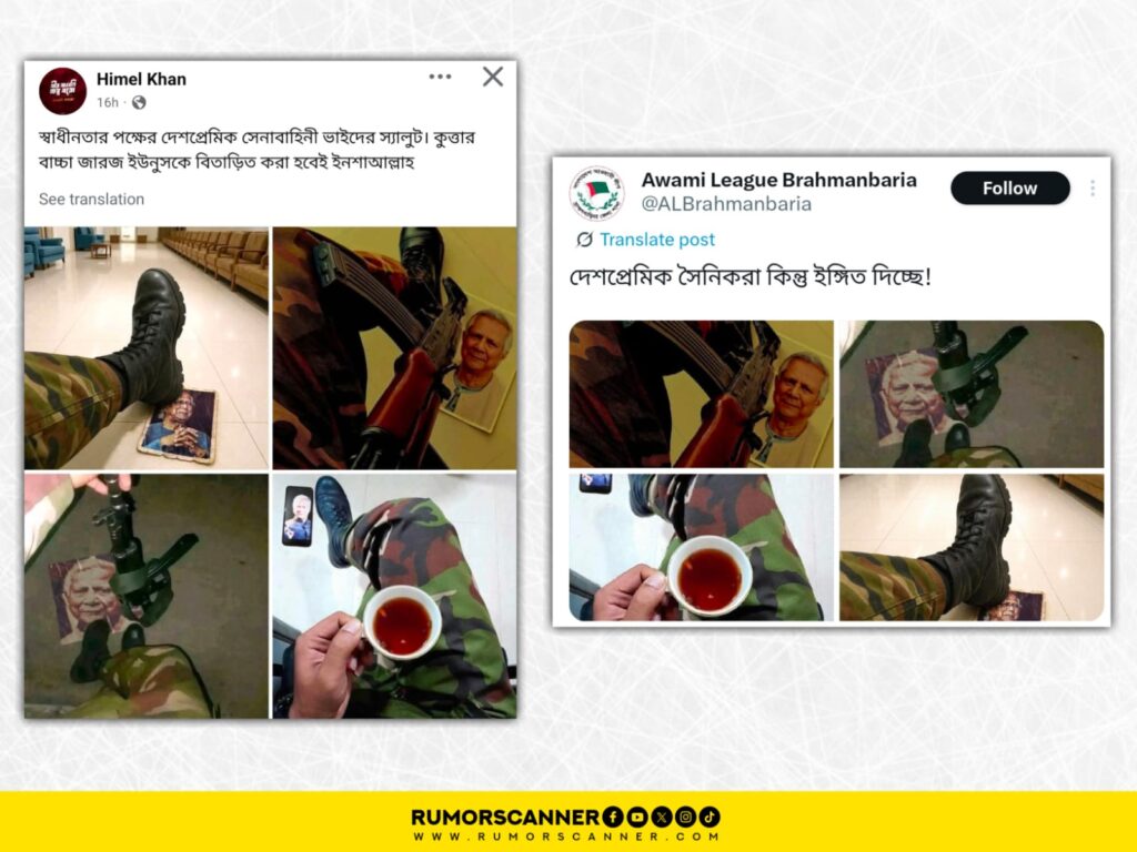 সুতরাং, সেনাসদস্য ড. ইউনূসের ছবি মাড়াচ্ছেন দাবিতে প্রচারিত ছবিগুলো ভুয়া।