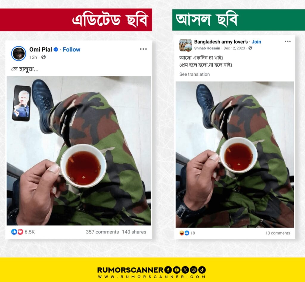 দ্বিতীয় ছবিতে একজন সেনাসদস্যের হাতে চায়ের কাপ এবং পায়ের কাছে একটি স্মার্টফোনে ড. মুহাম্মদ ইউনূসের ছবি দেখা যায়। এ বিষয়ে অনুসন্ধানে ২০২৩ সালের ১২ ডিসেম্বর ‘Bangladesh army lover’s’ নামের একটি ফেসবুক গ্রুপে মূল ছবি পাওয়া যায়। মূল ছবিতে সেনাসদস্যের হাতে চায়ের কাপ থাকলেও পায়ের কাছে কোনো স্মার্টফোন ছিল না। ফলে স্মার্টফোনে ড. ইউনূসের ছবি থাকার প্রশ্নই ওঠে না। অর্থাৎ, এই ছবিতে সম্পাদনা করে ড. ইউনূসের ছবি সংযোজন করা হয়েছে।