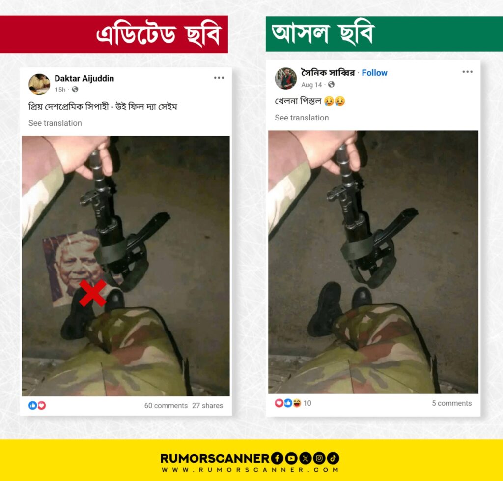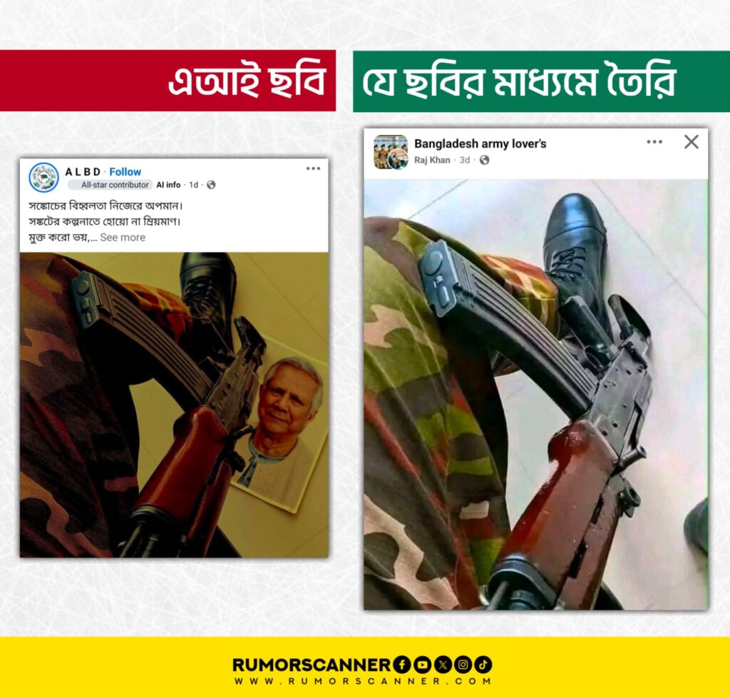 প্রথম ছবিতে একজন সেনাসদস্যের বুটের নিচে ড. ইউনূসের ছবি দেখা যায়। এই বিষয়ে অনুসন্ধানে ‘সৈনিক সাব্বির’ নামের একটি ফেসবুক প্রোফাইলে গত ১৪ আগস্ট প্রকাশিত মূল ছবি পাওয়া যায়। মূল ছবির সঙ্গে আলোচিত ছবির অন্যান্য বিষয়বস্তুর সঙ্গে মিল থাকলেও ওই ছবিতে সেনাসদস্যের বুটের নিচে ড. ইউনূসের ছবি নেই। অর্থাৎ, ফেসবুকে পাওয়া এই মূল ছবিটি ডিজিটাল প্রযুক্তির মাধ্যমে সম্পাদনা করে আলোচিত ছবিটি তৈরি করা হয়েছে।