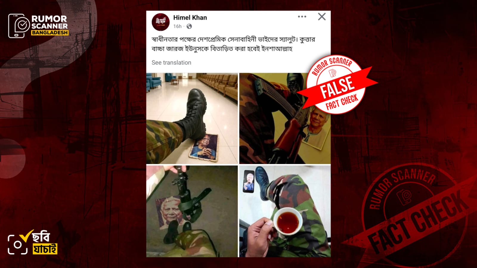 অন্তর্বর্তীকালীন সরকারের প্রধান উপদেষ্টা অধ্যাপক মুহাম্মদ ইউনূস ও সেনাবাহিনীর এক সদস্যকে ঘিরে অন্তত চারটি ছবি ইন্টারনেটে ছড়িয়ে পড়েছে। এর মধ্যে দুটি ছবিতে সেনাসদস্যের বুটের নিচে ড. ইউনূসের ছবি দেখা যায়, আর বাকি দুটি ছবিতে তার ছবি পায়ের পাশে রাখা অবস্থায় রয়েছে। ছবিগুলো বাস্তব ঘটনার দাবি করে ইন্টারনেটে প্রচারিত হচ্ছে।