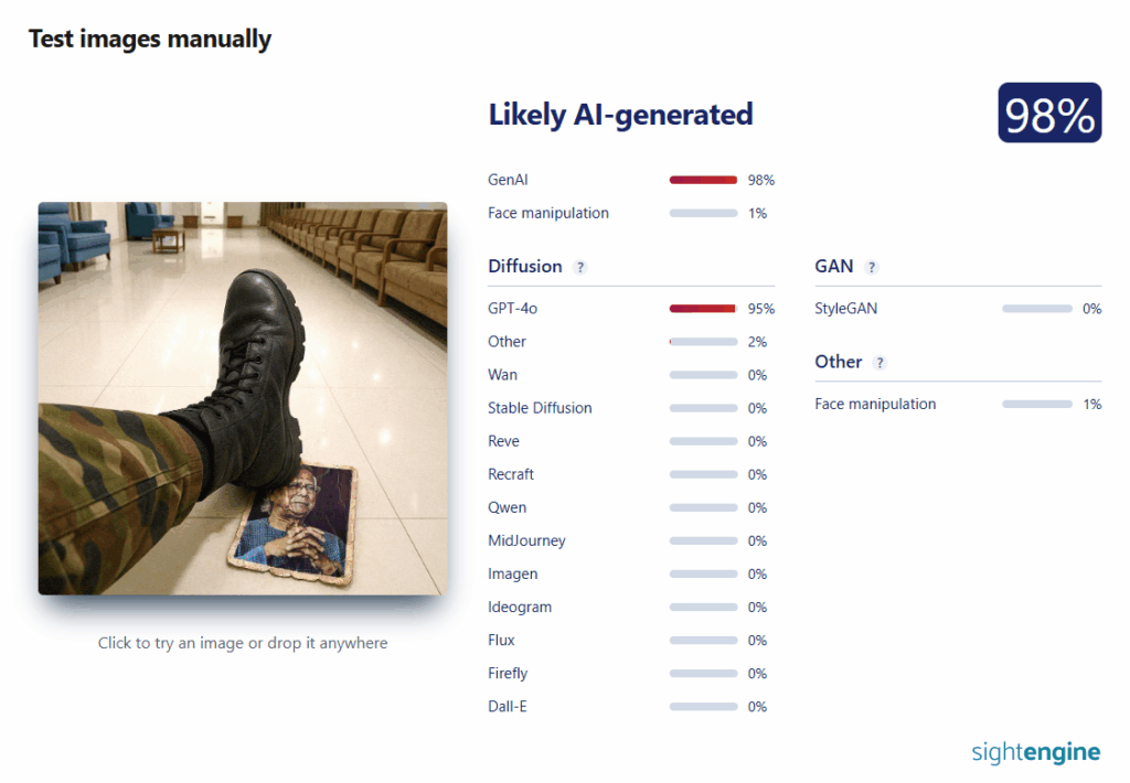 এ বিষয়ে আরও নিশ্চিত হতে ছবিটি এআই কনটেন্ট শনাক্তকারী ওয়েবসাইটে সাইটইঞ্জিনে বিশ্লেষণ করা হয়। বিশ্লেষণে দেখা যায়, ছবিটি এআই দিয়ে তৈরি হওয়ার সম্ভাবনা ৯৮ শতাংশ।