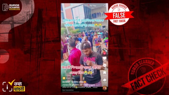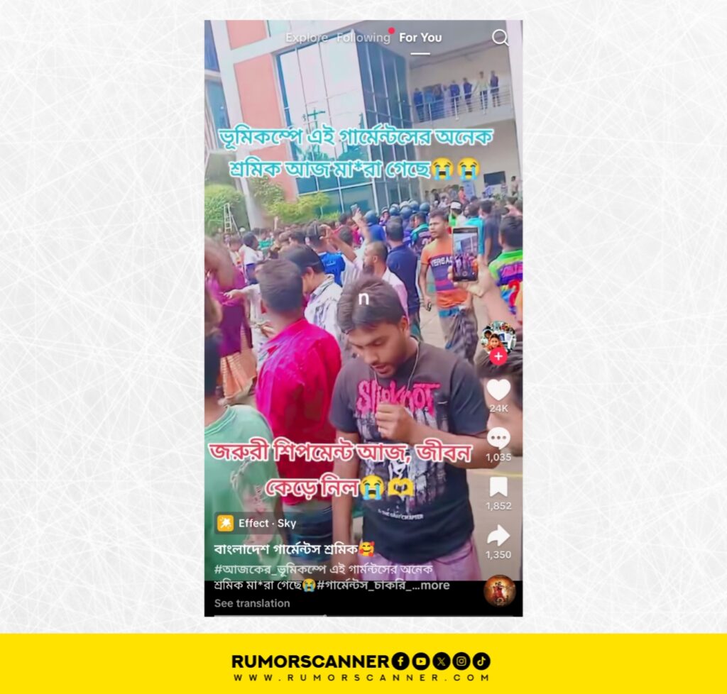 ২১ নভেম্বর সকাল ১০টা ৩৮ মিনিটে দেশের বিভিন্ন স্থানে ভূমিকম্প অনুভূত হয়েছে। আবহাওয়া অধিদপ্তরের তথ্য অনুযায়ী, রিখটার স্কেলে এর মাত্রা ছিল ৫ দশমিক ৭। এরই প্রেক্ষিতে সামাজিক যোগাযোগ মাধ্যমে একটি ভিডিও ফুটেজ প্রচার করে দাবি করা হচ্ছে, ভূমিকম্পে এই গার্মেন্টসের অনেক শ্রমিক মারা গেছেন।