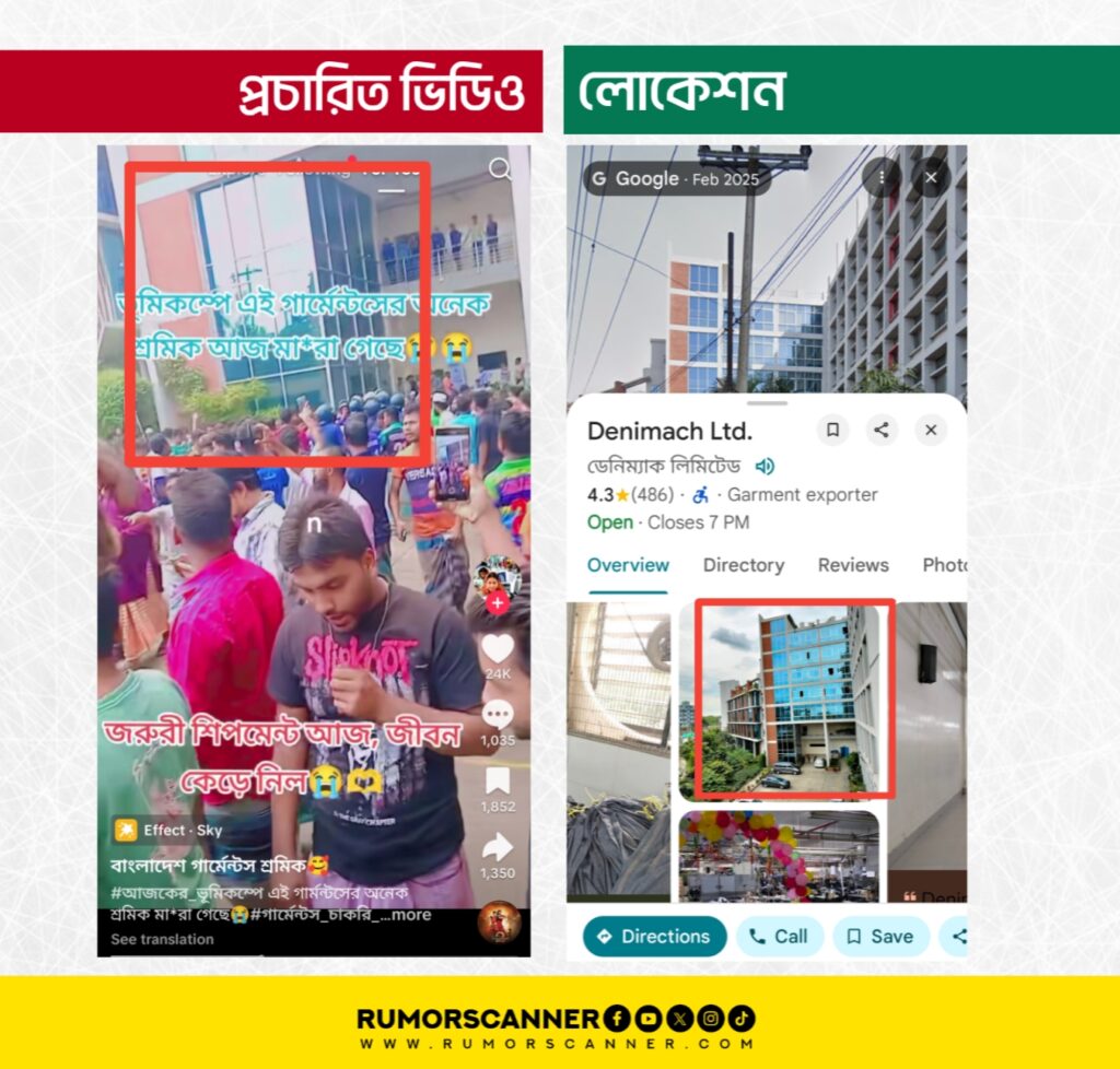 এ বিষয়ে অনুসন্ধানে গুগল ম্যাপে গাজীপুরের মাওনায় একই স্থান খুঁজে পাওয়া যায়। গুগলের স্ট্রোক ভিউ প্রযুক্তির মাধ্যমে দেখা যায়, এই কারখানার নাম ডেনিম্যাক লিমিটেড।