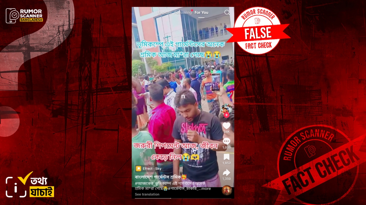 রিউমর স্ক্যানার টিমের অনুসন্ধানে জানা যায়, এটি গাজীপুরের ডেনিমেক লিমিটেড নামের পোশাক কারখানার দৃশ্য এবং ভূমিকম্পে এই কারখানায় অনেক শ্রমিক নিহতের দাবিটি সঠিক নয়। প্রকৃতপক্ষে, ভূমিকম্পের সময় কারখানা থেকে বের হতে গিয়ে অনেক শ্রমিক আহত হলেও কেউ মারা যায়নি।