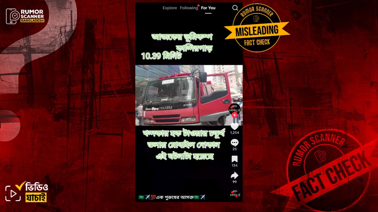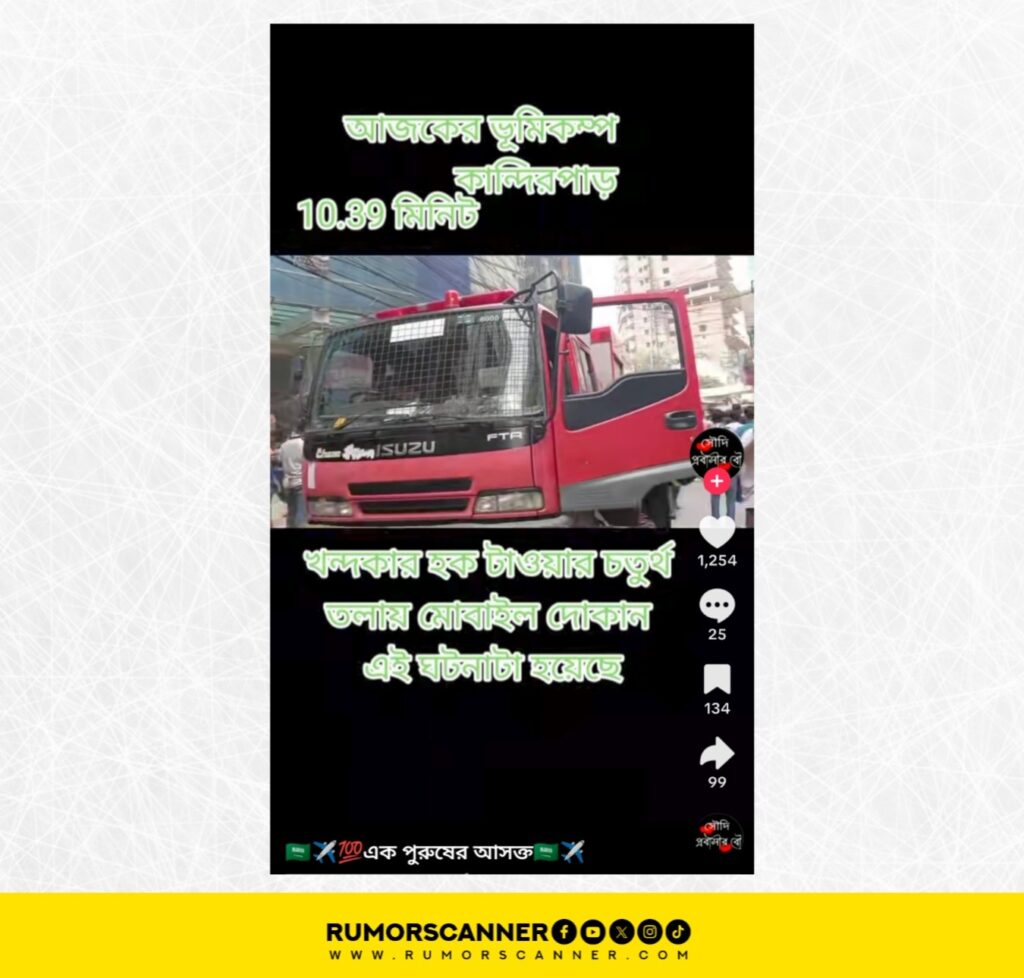 রিউমর স্ক্যানার টিমের অনুসন্ধানে জানা যায়, কুমিল্লার খন্দকার হক টাওয়ারে আগুন লাগার এই ভিডিওটি সাম্প্রতিক সময়ের নয় এবং এর সাথে ভূমিকম্পেরও সম্পর্ক নেই। প্রকৃতপক্ষে, গত সেপ্টেম্বরে শপিংমলটির একটি মোবাইল দোকানে আগুন লাগার ঘটনাকে উক্ত দাবিতে প্রচার করা হয়েছে।