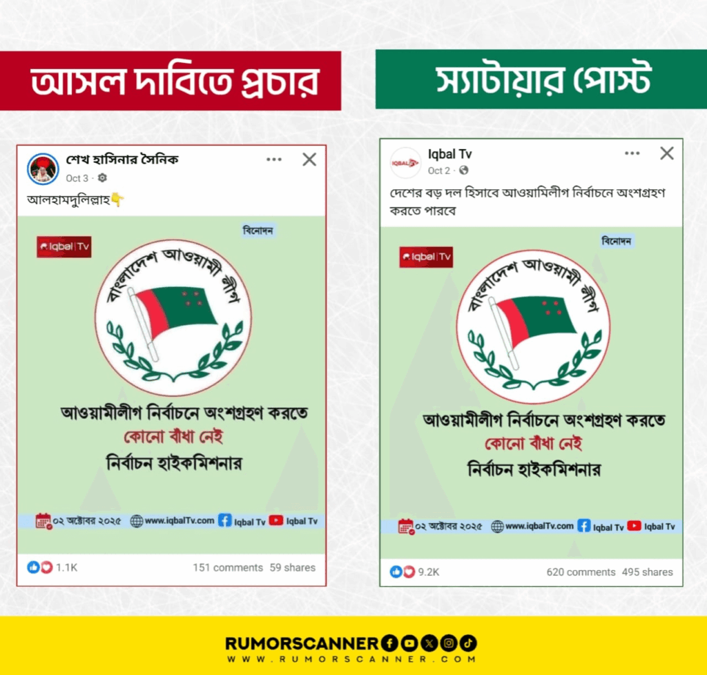 রিউমর স্ক্যানার টিমের অনুসন্ধানে জানা যায়, বাংলাদেশ নির্বাচন কমিশন কিংবা সংশ্লিষ্ট কোনো ব্যক্তি আগামী জাতীয় সংসদ নির্বাচনে আওয়ামীলীগের অংশগ্রহণ করতে কোনো বাঁধা নেই শীর্ষক কোনো বক্তব্য দেননি। প্রকৃতপক্ষে, একটি স্যাটায়ার পেজের ব্যাঙ্গাত্মক পোস্ট থেকে সূত্রপাত হওয়া ফটোকার্ডকে আসল খবর দাবিতে প্রচার করা হয়েছে।