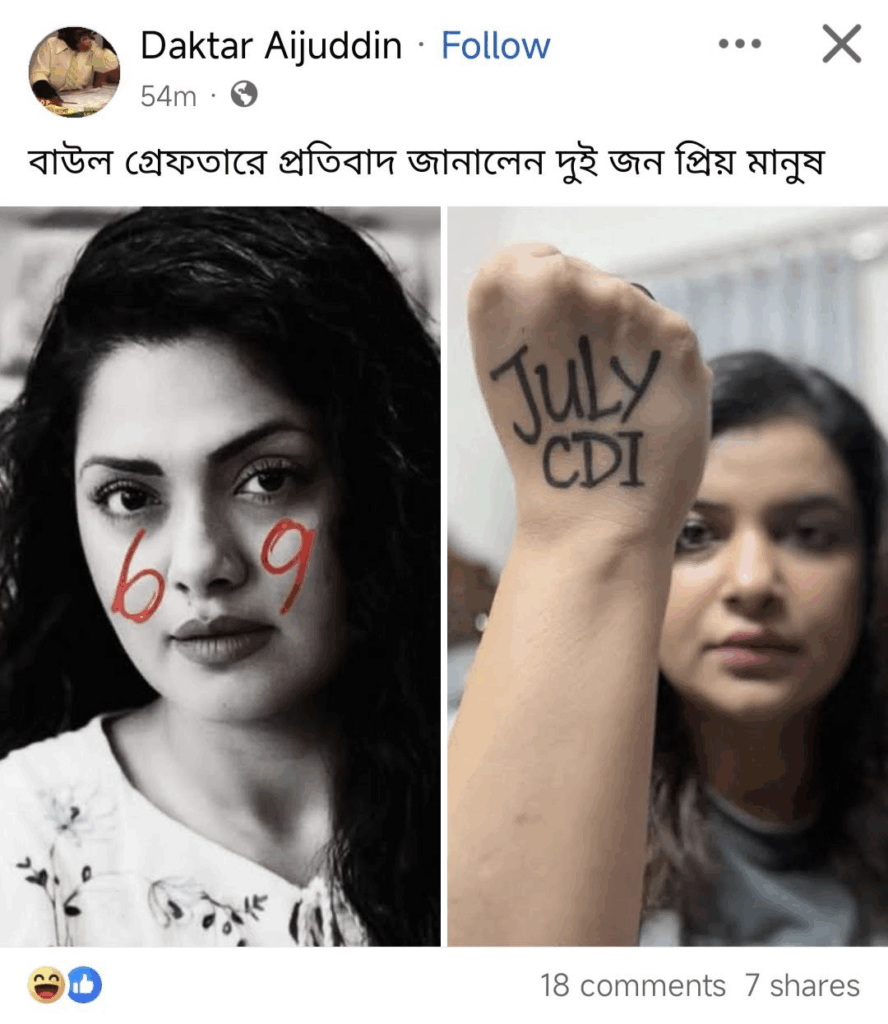সম্প্রতি, অভিনেত্রী নুসরাত ইমরোজ তিশা এবং শবনম ফারিয়া বাউল শিল্পী আবুল সরকারকে গ্রেফতারের প্রতিবাদ জানাচ্ছেন দাবিতে পৃথক দুইটি ছবি সামাজিক যোগাযোগমাধ্যমে প্রচার করা হয়েছে।