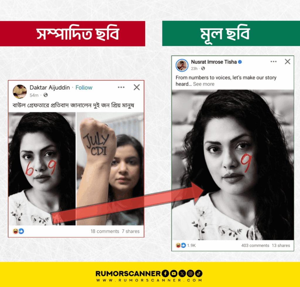 এ বিষয়ে অনুসন্ধানে অভিনেত্রী নুসরাত ইমরোজ তিশার ফেসবুক অ্যাকাউন্টে গত ২৫ নভেম্বরে প্রকাশিত একটি ছবি খুঁজে পাওয়া যায়। উক্ত ছবিটি পর্যবেক্ষণে দেখা যায়, মূল ছবিটিতে তিশার মুখে একপাশে 9 লেখা থাকলেও অন্যপাশে 6 লেখা সংযুক্ত করা হয়েছে।