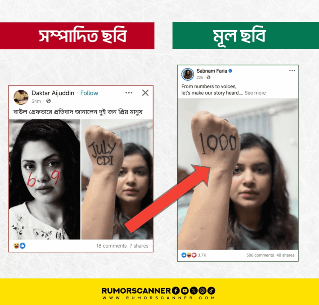 এ বিষয়ে অনুসন্ধানে ছোটপর্দার অভিনেত্রী শবনম ফারিয়ার ফেসবুক অ্যাকাউন্টে গত ২৫ নভেম্বরে প্রকাশিত একটি ছবি খুঁজে পাওয়া যায়। উক্ত ছবিটি পর্যবেক্ষণে ১০০০ শীর্ষক সংখ্যা দেখা গেলেও আলোচিত দাবিতে প্রচারিত ছবিতে এর স্থলে ‘JULY CDI’ শীর্ষক লিখা সংযুক্ত করা হয়েছে।