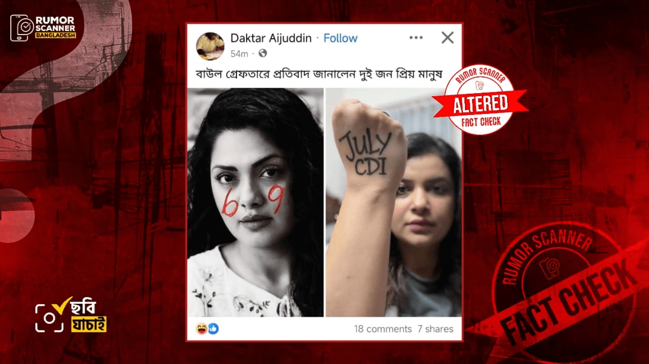 রিউমর স্ক্যানার টিমের অনুসন্ধানে জানা যায়, প্রচারিত ছবি দুইটি আসল নয়। প্রকৃতপক্ষে, অভিনেত্রী নুসরাত ইমরোজ তিশা এবং শবনম ফারিয়ার ভিন্ন দুইটি ছবি ডিজিটাল প্রযুক্তির সহায়তায় বিকৃত করে আলোচিত দাবি সংবলিত ছবিটি প্রচার করা হয়েছে।