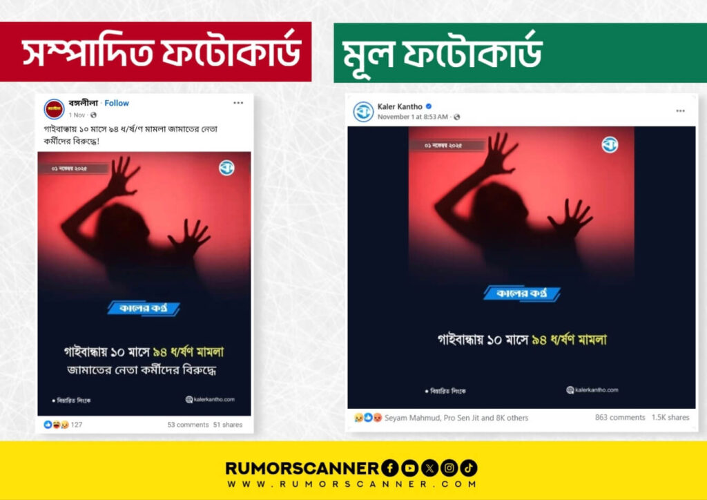 অর্থাৎ, কালের কণ্ঠের ফেসবুক পেজে ‘গাইবান্ধায় ১০ মাসে ৯৪ ধর্ষণ মামলা’ শীর্ষক শিরোনামে প্রকাশিত ফটোকার্ডটি ডিজিটাল প্রযুক্তির সহায়তায় সম্পাদনার মাধ্যমে শিরোনাম পরিবর্তন করে আলোচিত ফটোকার্ডটি তৈরি করা হয়েছে।