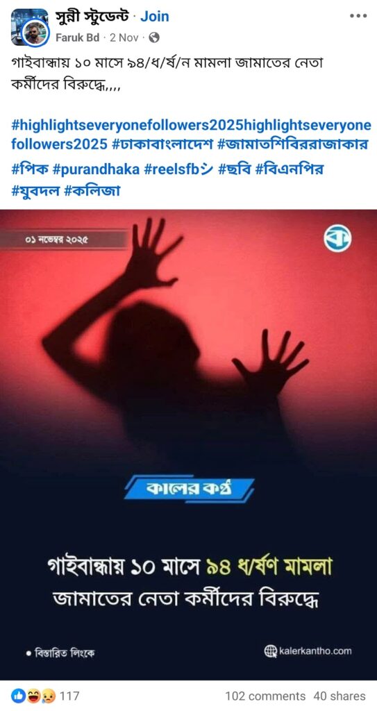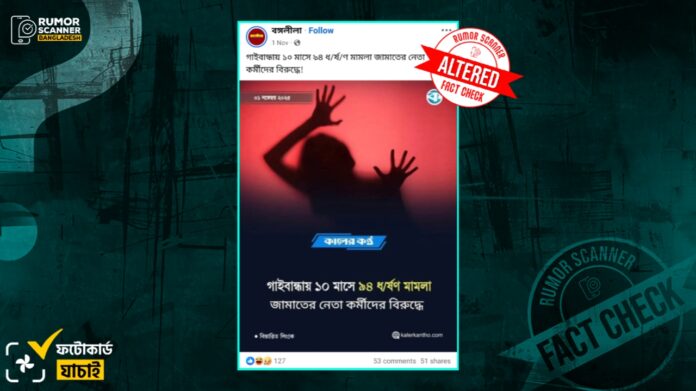 সম্প্রতি, ‘গাইবান্ধায় ১০ মাসে ৯৪ ধর্ষণ মামলা জামাতের নেতা কর্মীদের বিরুদ্ধে’ শীর্ষক তথ্যে বা শিরোনামে কালের কণ্ঠের ডিজাইন সংবলিত একটি ফটোকার্ড সামাজিক যোগাযোগমাধ্যমে ছড়িয়ে পড়েছে।