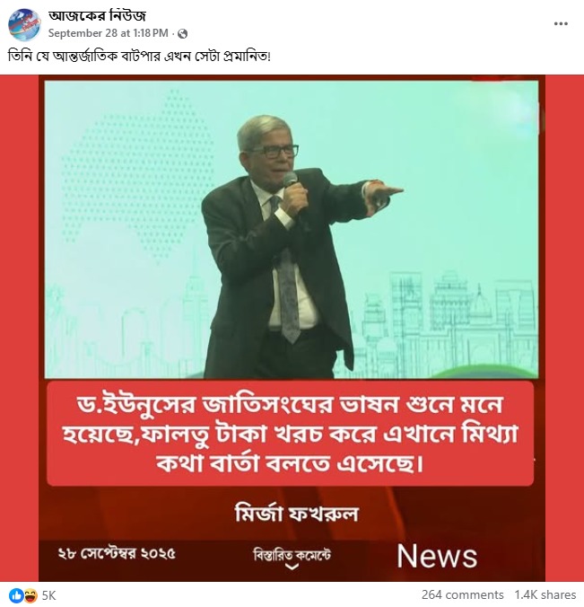 সম্প্রতি, ‘ড.ইউনুসের জাতিসংঘের ভাষন শুনে মনে হয়েছে, ফালতু টাকা খরচ করে এখানে মিথ্যা কথা বার্তা বলতে এসেছে।’- শীর্ষক মন্তব্যটি বিএনপির মহাসচিব মির্জা ফখরুল ইসলাম আলমগীর করেছেন দাবিতে একটি ফটোকার্ড সামাজিক যোগাযোগমাধ্যমে ছড়িয়ে পড়েছে।
