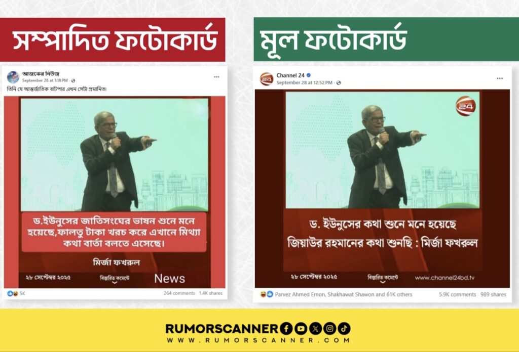 রিউমর স্ক্যানার টিমের অনুসন্ধানে জানা যায়, জাতিসংঘে ড. মুহাম্মদ ইউনূসের দেওয়া ভাষণ নিয়ে মির্জা ফখরুল ইসলাম আলমগীর এমন কোনো মন্তব্য করেননি। প্রকৃতপক্ষে, মির্জা ফখরুলের মন্তব্য নিয়ে চ্যানেল ২৪ কর্তৃক প্রকাশিত একটি ফটোকার্ড ডিজিটাল প্রযুক্তির সহায়তায় সম্পাদনা করে আলোচিত ফটোকার্ডটি তৈরি করা হয়েছে।