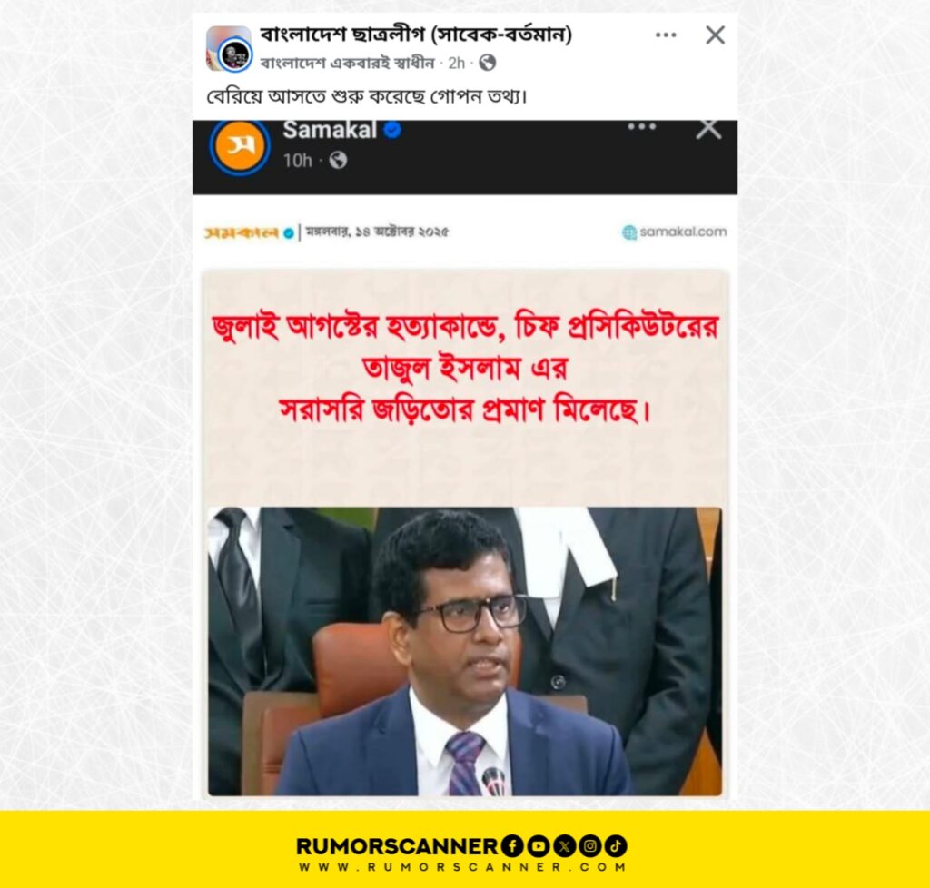সম্প্রতি “জুলাই আগস্টের হত্যাকান্ডে, চিফ প্রসিকিউটরের তাজুল ইসলাম এর সরাসরি জড়িতোর প্রমাণ মিলেছে।” শীর্ষক শিরোনামে মূলধারার সংবাদমাধ্যম সমকালের ডিজাইন সংবলিত একটি ফটোকার্ড সামাজিক যোগাযোগ মাধ্যমে প্রচার করা হয়েছে।