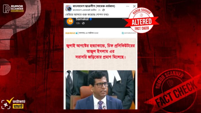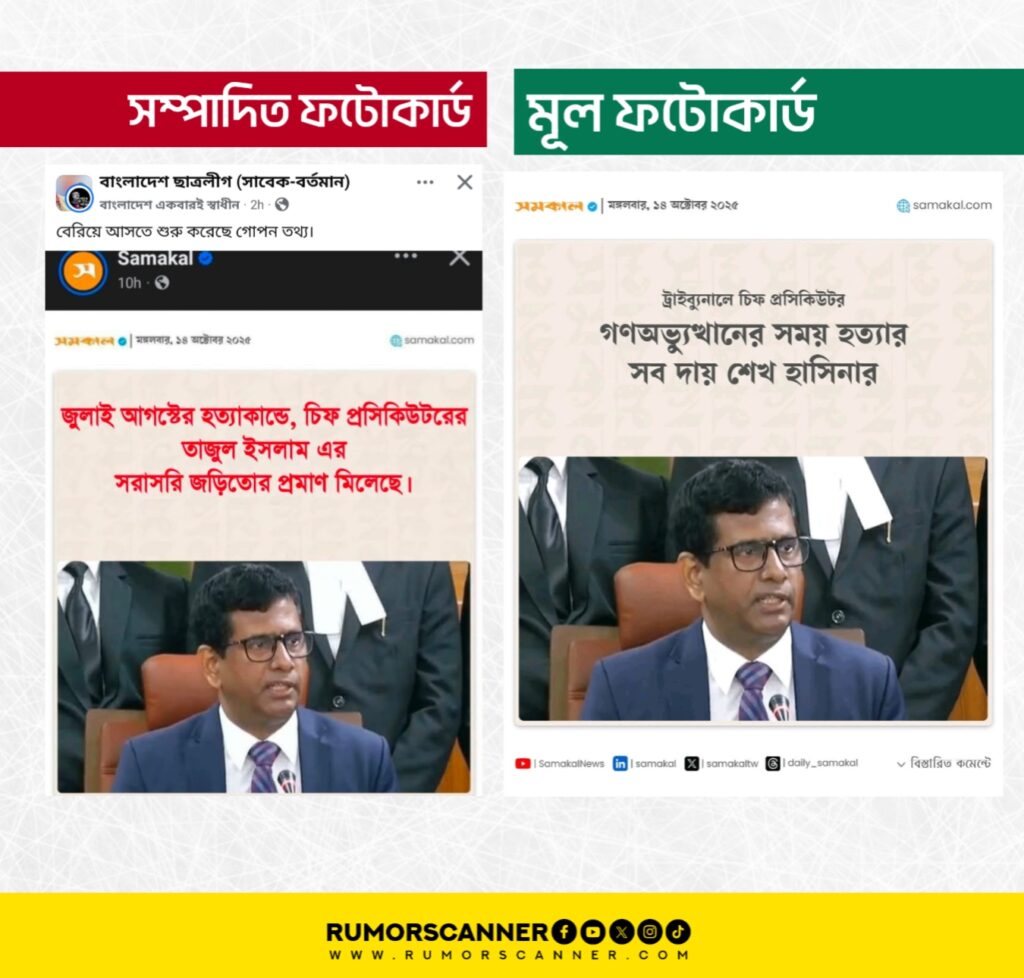 রিউমর স্ক্যানার টিমের অনুসন্ধানে জানা যায়, “জুলাই আগস্টের হত্যাকান্ডে, চিফ প্রসিকিউটরের তাজুল ইসলাম এর সরাসরি জড়িতোর প্রমাণ মিলেছে।” শীর্ষক তথ্যে বা শিরোনামে সমকাল কোনো ফটোকার্ড বা সংবাদ প্রকাশ করেনি বরং, ডিজিটাল প্রযুক্তির সহায়তায় গণমাধ্যমটির ভিন্ন একটি ফটোকার্ড সম্পাদনার মাধ্যমে এই ফটোকার্ডটি তৈরি করা হয়েছে।