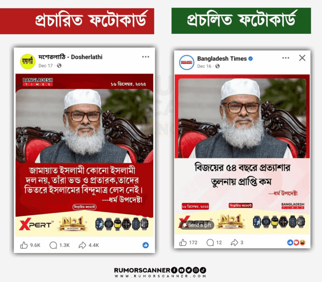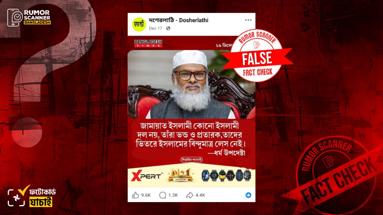 রিউমর স্ক্যানার টিমের অনুসন্ধানে জানা যায়, ‘জামায়াত ইসলামী কোনো ইসলামী দল নয়, তাঁরা ভন্ড ও প্রতারক, তাদের ভিতরে ইসলামের বিন্দুমাত্র লেস নেই। —ধর্ম উপদেষ্টা’ শিরোনামে বাংলাদেশ টাইমস এমন কোনো ফটোকার্ড বা সংবাদ প্রকাশ করেনি এবং ধর্ম উপদেষ্টা আ ফ ম খালিদ হোসেনও এরূপ কোনো মন্তব্য করেননি। প্রকৃতপক্ষে, ডিজিটাল প্রযুক্তির সহায়তায় বাংলাদেশ টাইমসের ফটোকার্ড ডিজাইনের আদলে ফটোকার্ড তৈরি করে ভুয়া এই দাবিটি প্রচার করা হয়েছে।