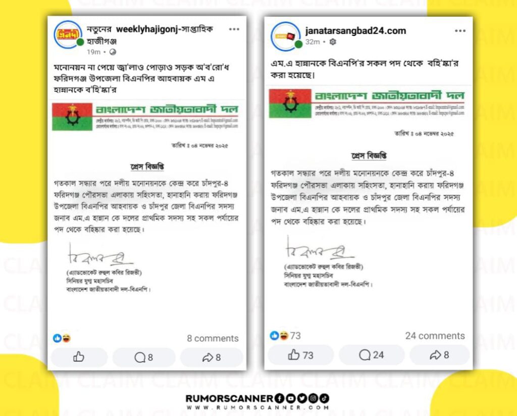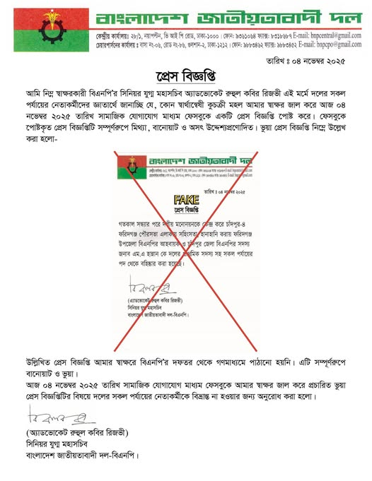 তবে, ৪ নভেম্বর বিএনপির ফেসবুক পেজ ও মিডিয়া সেলের ফেসবুক পেজে প্রকাশিত পৃথক দুটি পোস্টে একটি প্রেস বিজ্ঞপ্তি সংযুক্ত করা হয়। বিএনপির সিনিয়র যুগ্ম মহাসচিব অ্যাডভোকেট রুহুল কবির রিজভীর স্বাক্ষর যুক্ত উক্ত প্রেস বিজ্ঞপ্তিতে কথিত বহিষ্কারাদেশের প্রেস বিজ্ঞপ্তির ছবি যুক্ত করে বলা হয়, “কোন স্বার্থান্বেষী কুচক্রী মহল অ্যাডভোকেট রুহুল কবির রিজভীর স্বাক্ষর জাল করে ৪ নভেম্বর ২০২৫ তারিখ সামাজিক যোগাযোগ মাধ্যম ফেসবুকে একটি প্রেস বিজ্ঞপ্তি পোষ্ট করে। ফেসবুকে পোষ্টকৃত প্রেস বিজ্ঞপ্তিটি সম্পূর্ণরুপে মিথ্যা, বানোয়াট ও অসৎ উদ্দেশ্যপ্রণোদিত। উল্লিখিত প্রেস বিজ্ঞপ্তি তার স্বাক্ষরে বিএনপি’র দফতর থেকে গণমাধ্যমে পাঠানো হয়নি। এটি সম্পূর্ণরুপে বানোয়াট ও ভুয়া এবং এই ভুয়া প্রেস বিজ্ঞপ্তিটির বিষয়ে দলের সকল পর্যায়ের নেতাকর্মীকে বিভ্রান্ত না হওয়ার জন্য অনুরোধ করা হয়।”
