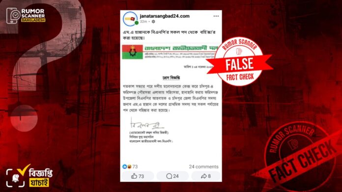 রিউমর স্ক্যানার টিমের অনুসন্ধানে জানা যায়, চাঁদপুর জেলার ফরিদগঞ্জ উপজেলা বিএনপির আহ্বায়ক এম এ হান্নানকে বিএনপির প্রাথমিক সদস্য পদসহ সকল পর্যায়ের পদ থেকে বহিষ্কার করা হয়েছে দাবিতে প্রচারিত প্রেস বিজ্ঞপ্তিটি ভুয়া। প্রকৃতপক্ষে, বিএনপির কেন্দ্রীয় কমিটির পক্ষ থেকে এম এ হান্নানকে বহিষ্কার করা নিয়ে এমন কোনো প্রেস বিজ্ঞপ্তি প্রকাশ করা হয়নি।