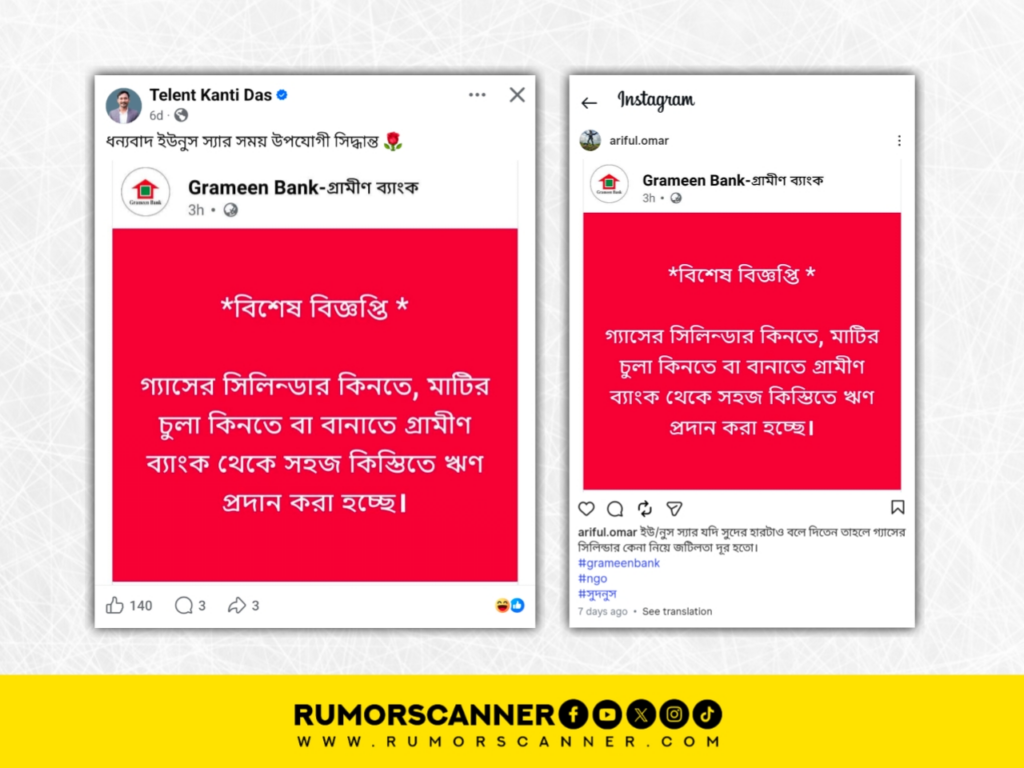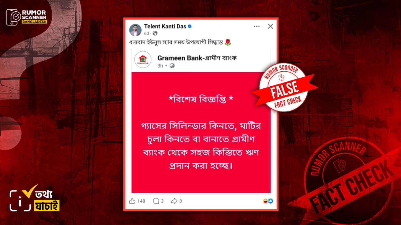 রিউমর স্ক্যানার টিমের অনুসন্ধানে দেখা যায়, চলমান এলপিজি সিলিন্ডার সংকট মোকাবেলায় গ্যাসের সিলিন্ডার ও মাটির চুলা কিনতে বা বানাতে গ্রামীণ ব্যাংকের সহজ কিস্তিতে ঋণ প্রদানের দাবিটি সঠিক নয়। প্রকৃতপক্ষে, গ্রামীণ ব্যাংকের নামে পরিচালিত ভুয়া একটি পেজ থেকে আলোচিত দাবিতে বিজ্ঞপ্তিটি প্রচার করা হয়েছে।