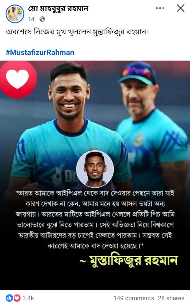 ভারতীয় ক্রিকেট বোর্ডের (বিসিসিআই) নির্দেশে বাংলাদেশের পেসার মুস্তাফিজুর রহমানকে স্কোয়াড থেকে বাদ দিয়েছে আইপিএলের ফ্র্যাঞ্চাইজি দল কলকাতা নাইট রাইডার্স। এরই প্রেক্ষিতে, “ভারত আমাকে আইপিএল থেকে বাদ দেওয়ার পেছনে তারা যাই কারণ দেখাক না কেন, আমার মনে হয় আসল ভয়টা অন্য জায়গায়। ভারতের মাটিতে আইপিএল খেললে প্রতিটি পিচ আমি ভালোভাবে বুঝে নিতে পারতাম। সেই অভিজ্ঞতা নিয়ে বিশ্বকাপে ভারতীয় ব্যাটারদের বড় চাপেই ফেলতে পারতাম। সম্ভবত সেই কারণেই আমাকে বাদ দেওয়া হয়েছে।” শীর্ষক একটি মন্তব্য মুস্তাফিজুর রহমানের দাবিতে সামাজিক যোগাযোগমাধ্যমে ছড়িয়ে পড়েছে।