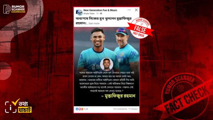 রিউমর স্ক্যানার টিমের অনুসন্ধানে জানা যায়, আইপিএল থেকে বাদ পড়া নিয়ে মুস্তাফিজুর রহমান এমন কোনো মন্তব্য করেননি। প্রকৃতপক্ষে, কোনোরকম নির্ভরযোগ্য তথ্যপ্রমাণ ছাড়াই মুস্তাফিজুর রহমানের নামে আলোচিত ভুয়া এই মন্তব্যটি প্রচার করা হয়েছে।