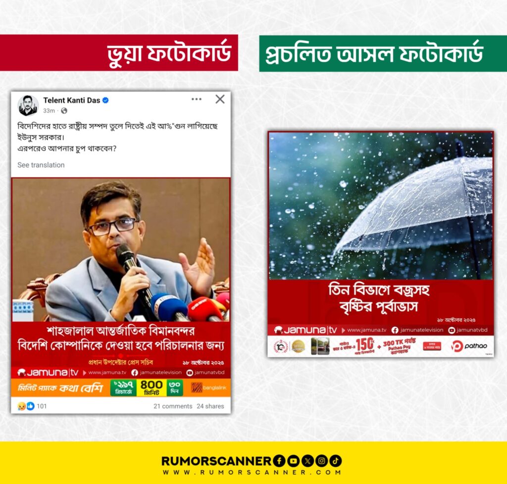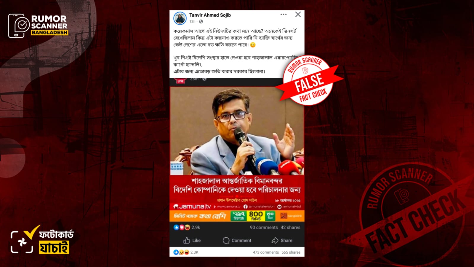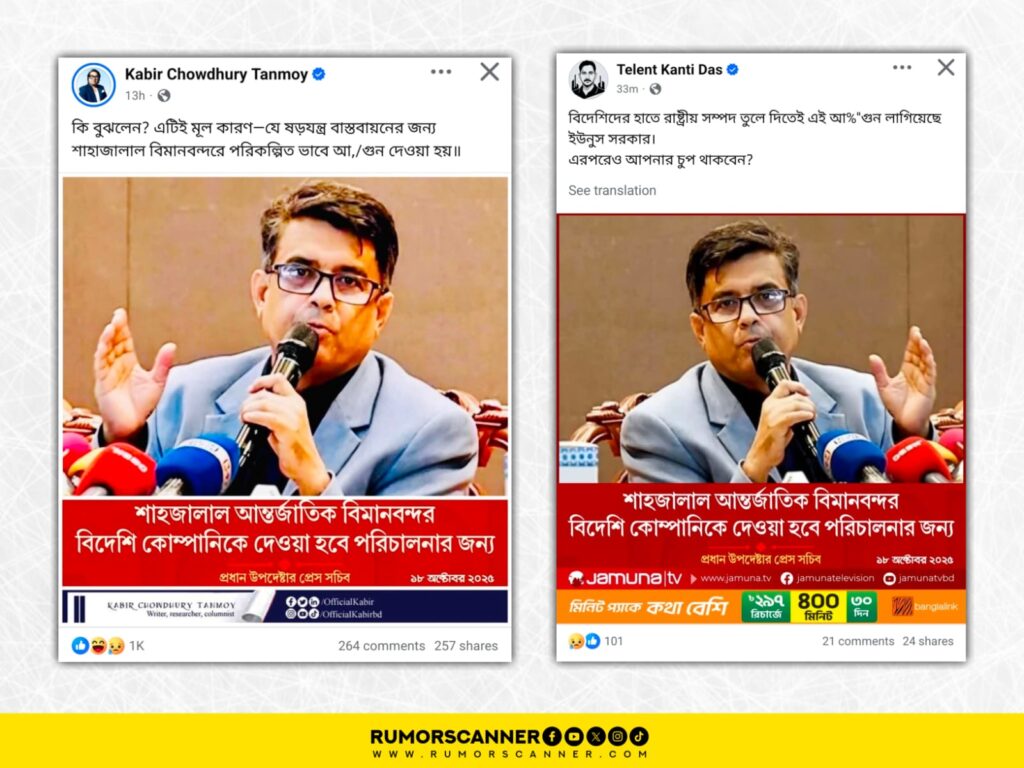 গতকাল (১৮ অক্টোবর) দুপুরের দিকে ঢাকার হজরত শাহজালাল আন্তর্জাতিক বিমানবন্দরের কার্গো ভিলেজ কমপ্লেক্স ভবনে ভয়াবহ অগ্নিকাণ্ডের ঘটনা ঘটে। এই ঘটনার পর প্রধান উপদেষ্টার প্রেস সচিব শফিকুল আলমকে উদ্ধৃত করে ‘শাহজালাল আন্তর্জাতিক বিমানবন্দর বিদেশি কোম্পানিকে দেওয়া হবে পরিচালনার জন্য’ শিরোনামে যমুনা টিভির লোগো ও ডিজাইন সংবলিত একটি ফটোকার্ড সামাজিক যোগাযোগ মাধ্যমে ছড়িয়ে পড়ে।
