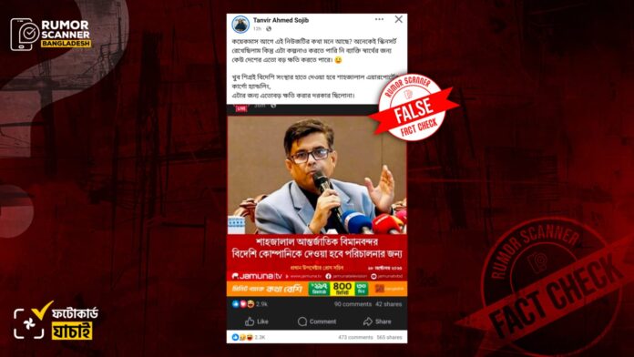 রিউমর স্ক্যানার টিমের অনুসন্ধানে জানা যায়, শাহজালাল আন্তর্জাতিক বিমানবন্দর বিদেশি কোম্পানিকে দেওয়া হবে বলে কোনো মন্তব্য করেননি শফিকুল আলম এবং যমুনা টিভিও এমন কোনো ফটোকার্ড প্রকাশ করেনি। বরং প্রযুক্তির মাধ্যমে গণমাধ্যমটির ফটোকার্ডের ডিজাইন নকল করে ও ভুয়া স্ক্রিনশট তৈরি করে আলোচিত দাবিটি ছড়িয়ে দেওয়া হয়েছে।