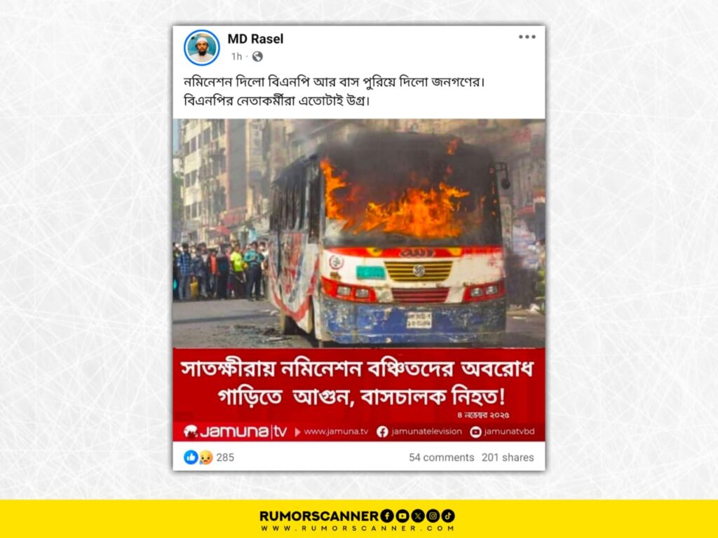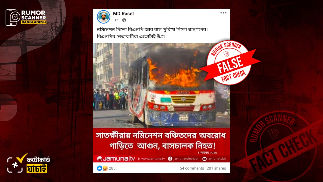 সুতরাং, “সাতক্ষীরায় নমিনেশন বঞ্চিতদের অবরোধে গাড়িতে আগুন, বাসচালক নিহত!” শিরোনামে যমুনা টিভির নামে প্রচারিত ফটোকার্ডটি সম্পূর্ণ ভুয়া ও বানোয়াট।