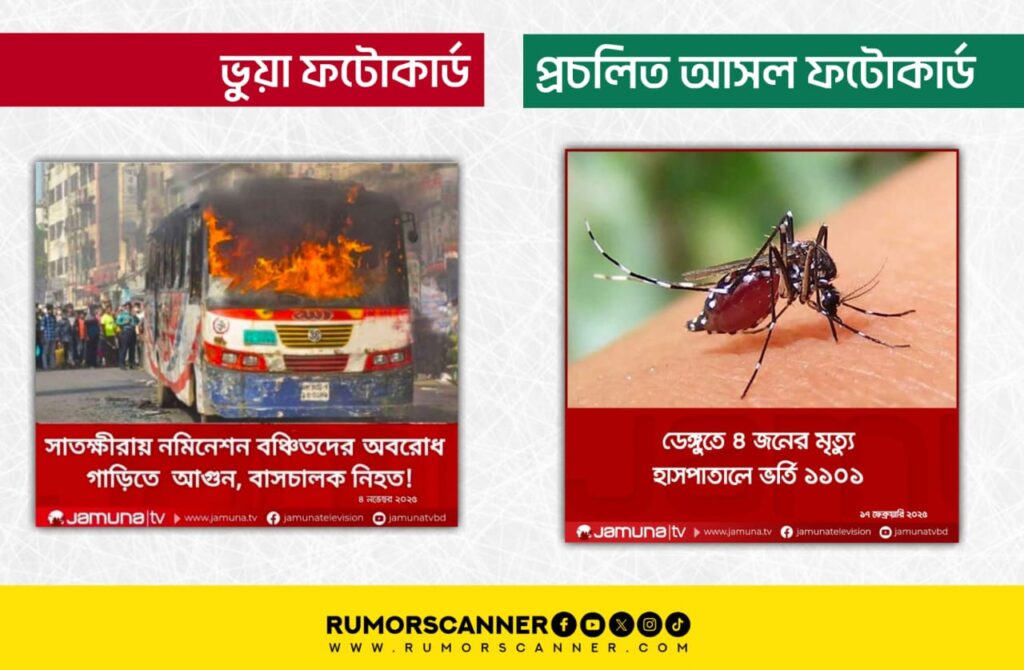 রিউমর স্ক্যানার টিমের অনুসন্ধানে জানা যায়, “সাতক্ষীরায় নমিনেশন বঞ্চিতদের অবরোধে গাড়িতে আগুন, বাসচালক নিহত!” শিরোনামে যমুনা টিভি কোনো ফটোকার্ড বা সংবাদ প্রকাশ করেনি এবং এমন কোনো ঘটনাও ঘটেনি। প্রকৃতপক্ষে, যমুনা টিভির ফটোকার্ডের নকশা নকল করে ডিজিটাল প্রযুক্তির সহায়তায় ভুয়া ফটোকার্ড তৈরি করে প্রচার করা হয়েছে।