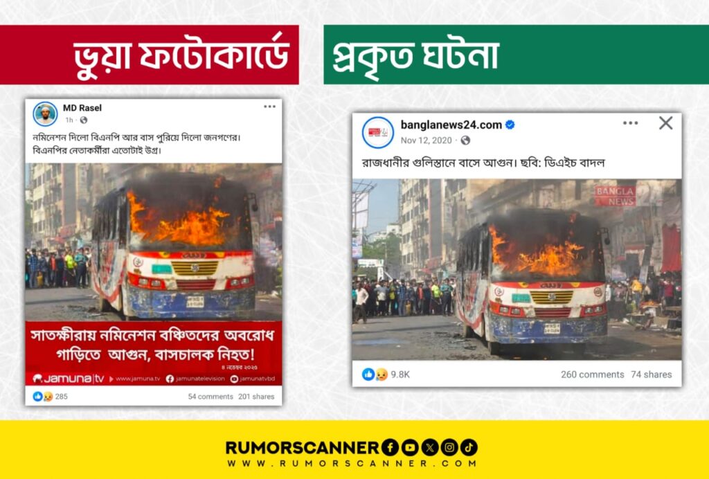 এছাড়া, ফটোকার্ডটিতে ব্যবহৃত ছবিটি সম্পর্কে অনুসন্ধানে জানা যায়, এটি একটি পুরোনো ছবি। ২০২০ সালের ১২ নভেম্বর বাংলানিউজ২৪-এর ফেসবুক পেজে প্রকাশিত এক পোস্টে একই ছবি পাওয়া যায়। পোস্টের ক্যাপশন অনুযায়ী, ছবিটি রাজধানীর গুলিস্তানে বাসে আগুন লাগার ঘটনার। একই ছবি সেদিন দৈনিক সমকালের একটি প্রতিবেদনেও ব্যবহৃত হয়েছিল। সেখানে উল্লেখ করা হয়, সেদিন দুপুর দেড়টার দিকে গুলিস্তান গোলাপশাহ মাজার এলাকায় ‘ভিক্টোর ক্লাসিক’ নামের একটি যাত্রীবাহী বাসে দুর্বৃত্তরা আগুন দেয়।