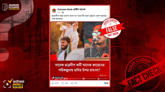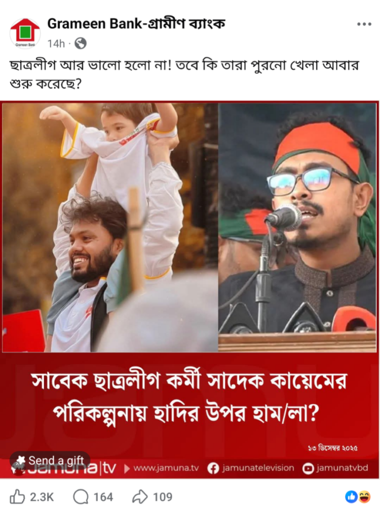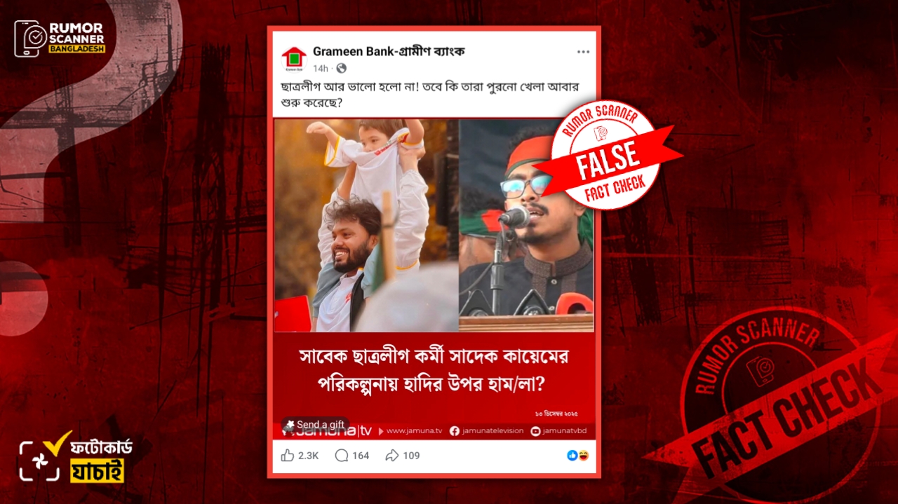 সুতরাং,‘সাবেক ছাত্রলীগ কর্মী সাদেক কায়েমের পরিকল্পনায় হাদির উপর হাম/লা?’ শিরোনামে যমুনা টেলিভিশনের নামে প্রচারিত ফটোকার্ডটি ভুয়া ও বানোয়াট।