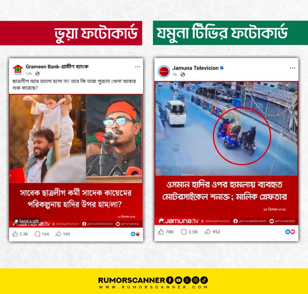 রিউমর স্ক্যানার টিমের অনুসন্ধানে দেখা যায়, ‘সাবেক ছাত্রলীগ কর্মী সাদেক কায়েমের পরিকল্পনায় হাদির উপর হাম/লা?’ শিরোনামে যমুনা টেলিভিশন কোনো ফটোকার্ড প্রকাশ করেনি। প্রকৃতপক্ষে, যমুনা টেলিভিশনের ফটোকার্ডের ডিজাইন নকল করে আলোচিত দাবিতে উক্ত ভুয়া ফটোকার্ডটি তৈরি করা হয়েছে।