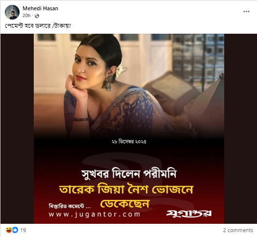 সম্প্রতি, ‘সুখবর দিলেন পরীমনি তারেক জিয়া নৈশ ভোজনে ডেকেছেন’ শীর্ষক শিরোনামে অভিনেত্রী পরি মণির ছবি যুক্ত করে যুগান্তরের ডিজাইন সম্বলিত একটি ফটোকার্ড সামাজিক যোগাযোগ মাধ্যমে ছড়িয়ে পড়েছে।