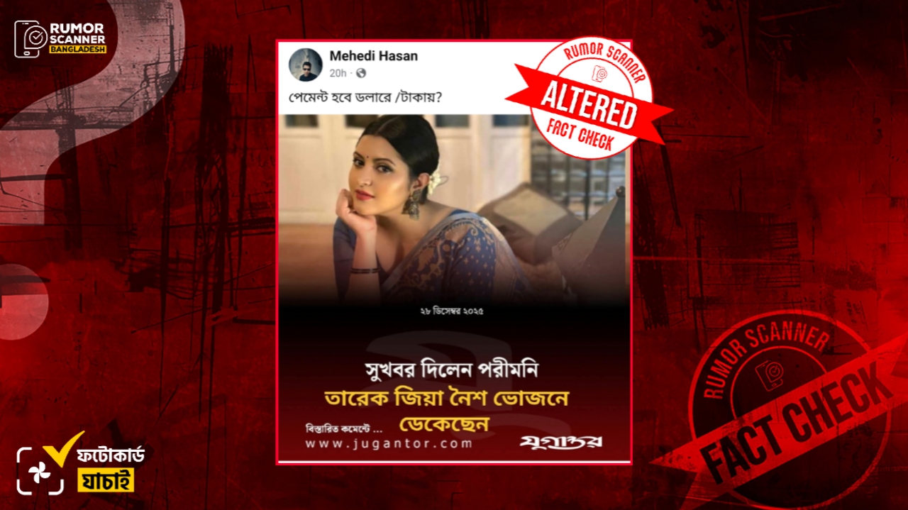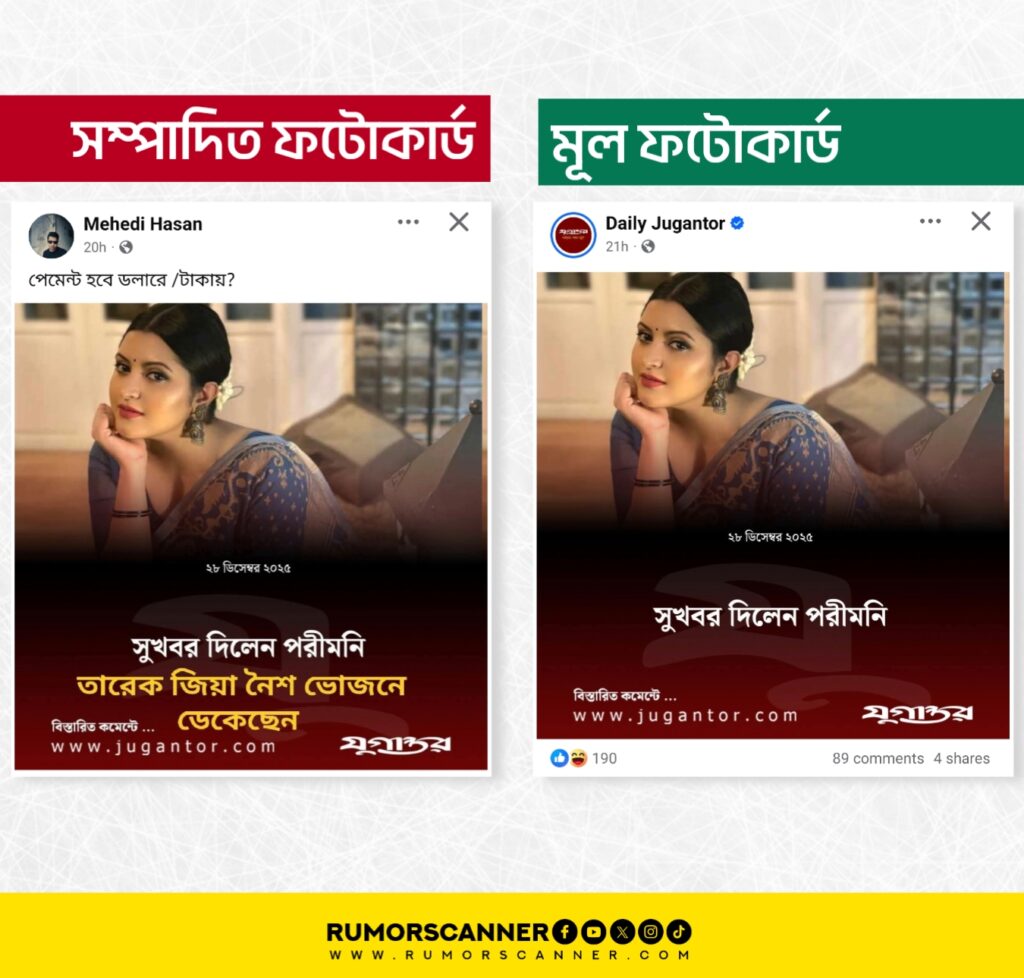 এ বিষয়ে অনুসন্ধানের শুরুতে আলোচিত ফটোকার্ডটি পর্যবেক্ষণ করে দেখা যায়, এতে যুগান্তরের লোগো ও পরী মণির ছবি রয়েছে এবং প্রকাশের তারিখ হিসেবে ২৮ ডিসেম্বর, ২০২৫ উল্লেখ রয়েছে। উক্ত তথ্যাবলীর সূত্র ধরে যুগান্তরের ফেসবুক পেজে প্রচারিত ফটোকার্ডগুলো পর্যবেক্ষণ করে উক্ত তারিখে আলোচিত শিরোনাম সংবলিত কোনো ফটোকার্ড খুঁজে পাওয়া যায়নি। এছাড়া, যুগান্তরের ওয়েবসাইট, ইউটিউব চ্যানেল এবং পরি মণির ফেসবুক পেজেও এ সংক্রান্ত কোনো তথ্য পাওয়া যায়নি।