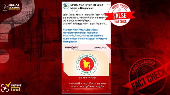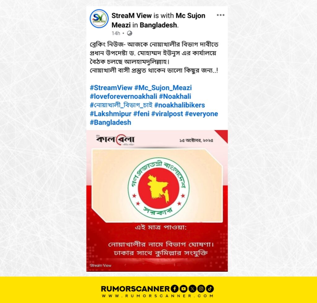 নোয়াখালীকে স্বতন্ত্র প্রশাসনিক বিভাগ ঘোষণার দাবিতে বেশ কয়েকদিন ধরেই আন্দোলন করে আসছে সংশ্লিষ্ট এলাকার মানুষেরা। এরই প্রেক্ষিতে সম্প্রতি “নোয়াখালীর নামে বিভাগ ঘোষণা৷ ঢাকার সাথে কুমিল্লার সংযুক্তি।” শিরোনামে জাতীয় দৈনিক কালবেলা পত্রিকার লোগো সংবলিত একটি ফটোকার্ড সামাজিক মাধ্যমে প্রচার করা হচ্ছে।