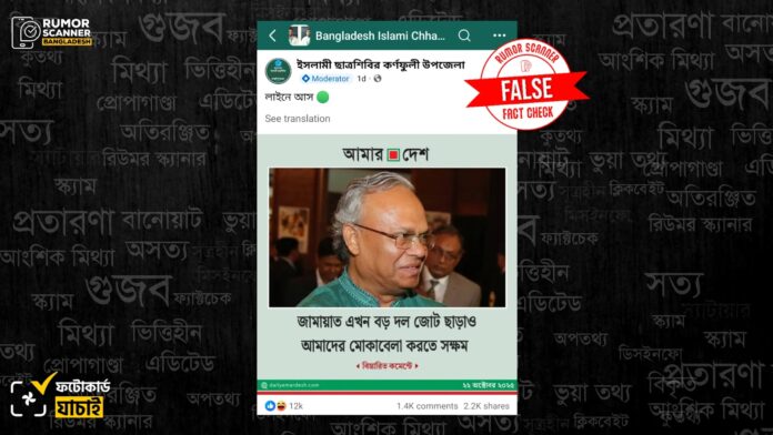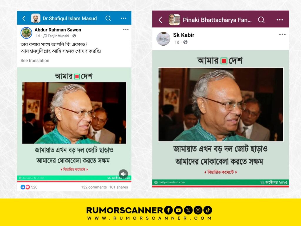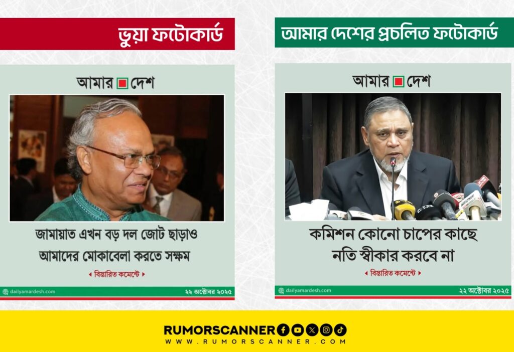 জামায়াতকে জড়িয়ে বিএনপি নেতা রিজভীর মন্তব্য দাবিতে আমার দেশের নামে ভুয়া ফটোকার্ড প্রচার