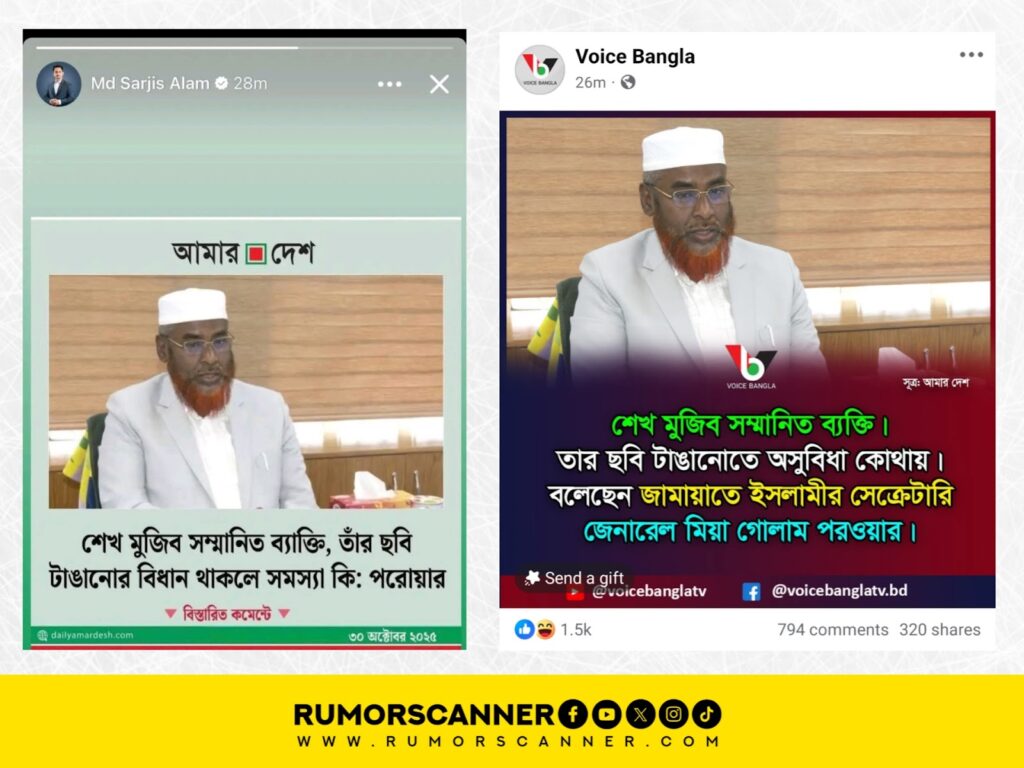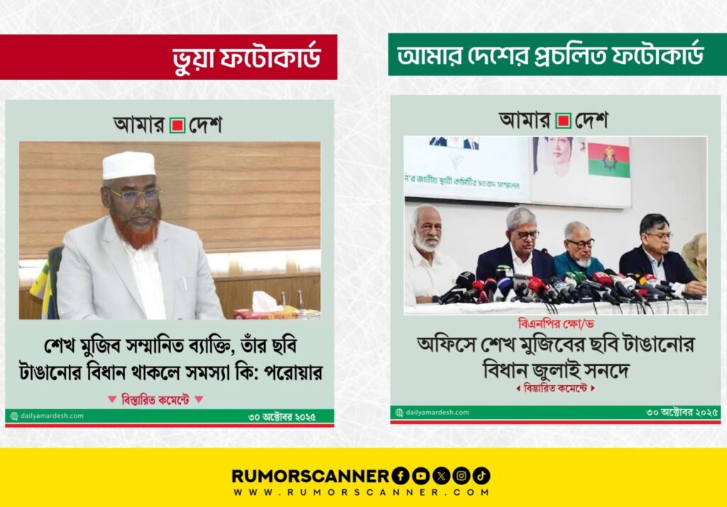 বৃহস্পতিবার (৩০ অক্টোবর) রাজধানীর গুলশানে বিএনপি চেয়ারপারসনের কার্যালয়ে আয়োজিত সংবাদ সম্মেলনে দলের মহাসচিব মির্জা ফখরুল ইসলাম আলমগীর সরকারি-বেসরকারি বিভিন্ন অফিসে শেখ মুজিবুর রহমানের ছবি টাঙানো সংক্রান্ত বিধান বিলুপ্তের প্রস্তাব জুলাই জাতীয় সনদে অন্তর্ভুক্ত না করার অভিযোগ তুলে এ বিষয়ে ক্ষোভ প্রকাশ করেছেন। এরই প্রেক্ষিতে বাংলাদেশ জামায়াতে ইসলামীর সেক্রেটারি জেনারেল মিয়া গোলাম পরওয়ার ‘শেখ মুজিব সম্মানিত ব্যাক্তি, তাঁর ছবি টাঙানোর বিধান থাকলে সমস্যা কি’ শীর্ষক মন্তব্য করেছেন দাবিতে দৈনিক আমার দেশের ডিজাইন সংবলিত একটি ফটোকার্ড সামাজিক যোগাযোগ মাধ্যমে প্রচার করা হয়েছে।