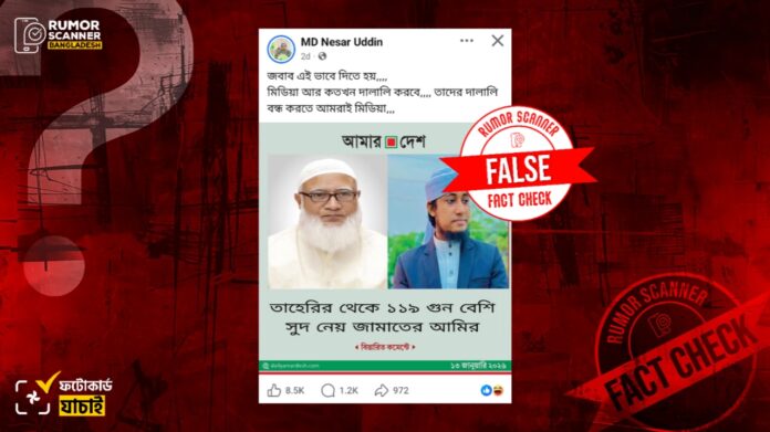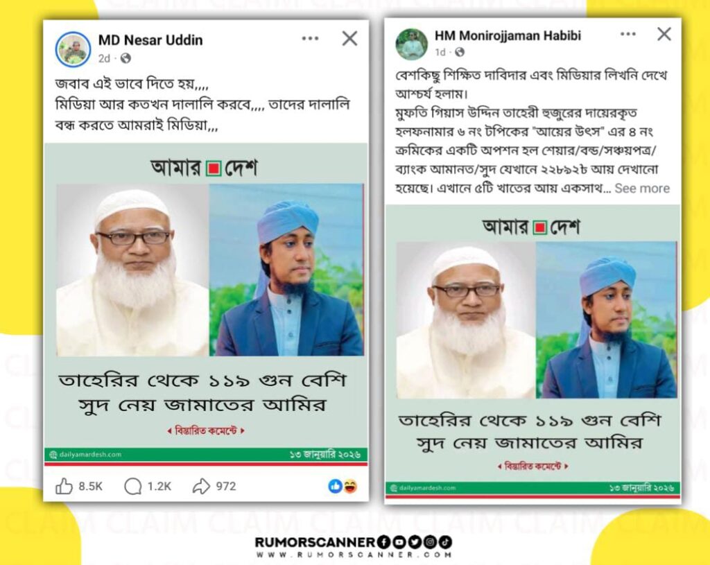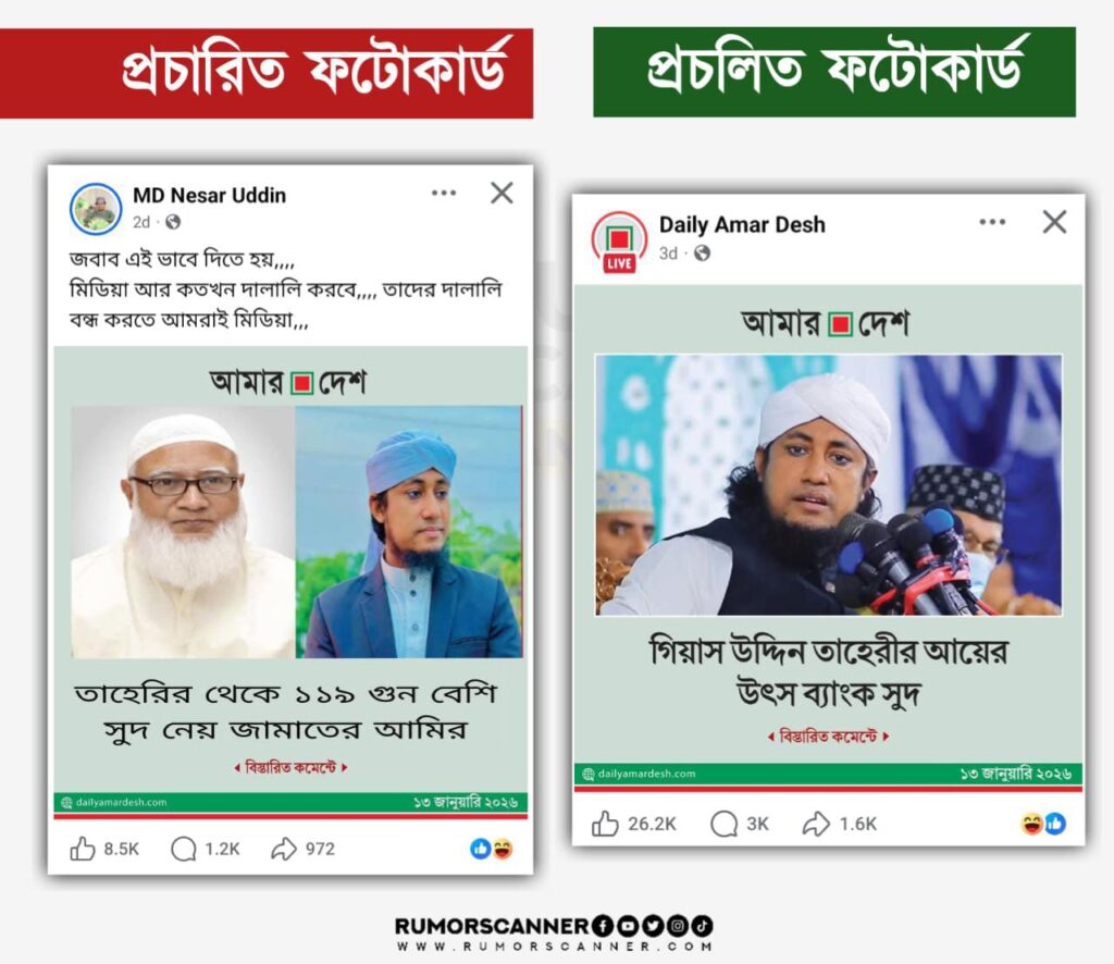 সম্প্রতি বাংলাদেশ জামায়াতে ইসলামীর আমীর ডা. শফিকুর রহমান ও হবিগঞ্জ-৪ আসনে বাংলাদেশ ইসলামী ফ্রন্টের প্রার্থী মো. গিয়াস উদ্দিন তাহেরীকে জড়িয়ে তাদের ছবিসহ ‘’তাহেরির থেকে ১১৯ গুন বেশি সুদ নেয় জামাতের আমির’ শিরোনামে সংবাদমাধ্যম আমার দেশের ডিজাইন সংবলিত একটি ফটোকার্ড সামাজিক যোগাযোগ মাধ্যমে প্রচার করা হয়েছে।
