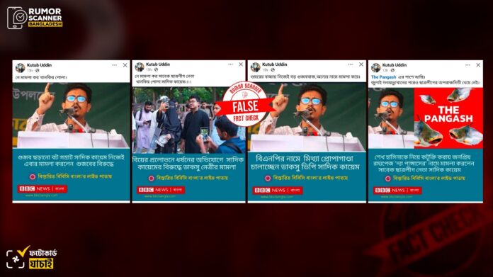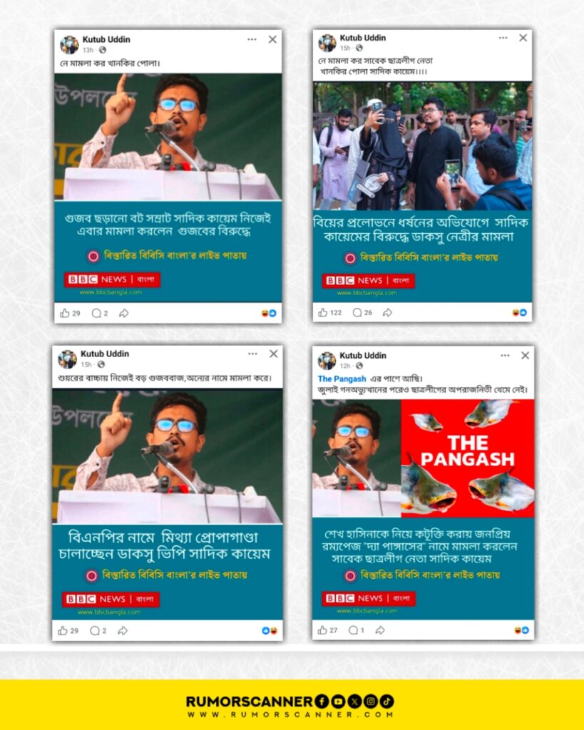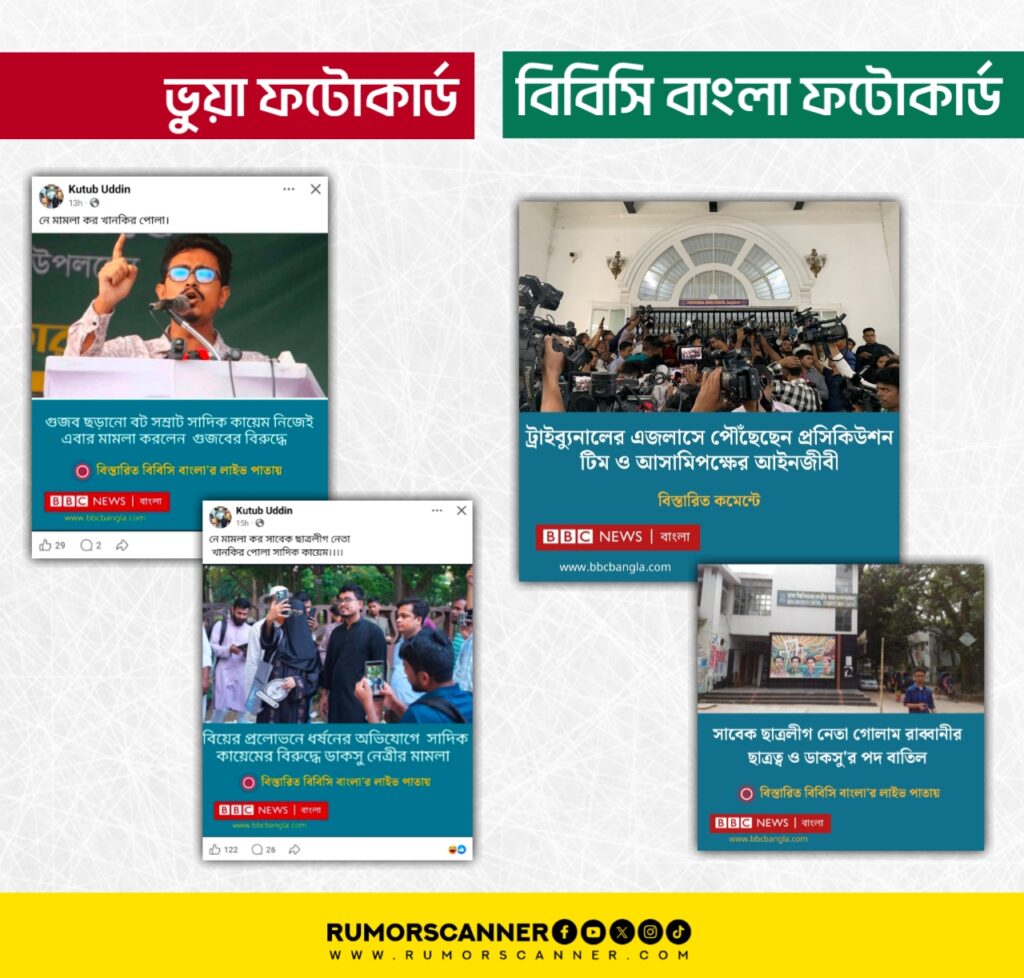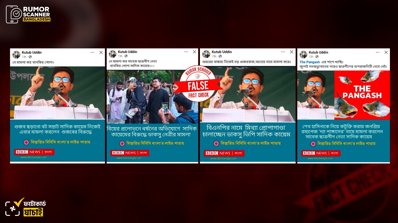 গত ১ ডিসেম্বর ঢাকা মহানগর পুলিশের গোয়েন্দা কার্যালয়ের (ডিবি) সাইবার ইউনিটে ফেসবুকে ‘কুরুচিপূর্ণ, অশালীন ও মানহানিকর মন্তব্য’ ছড়িয়ে দেওয়ার অভিযোগে ১৮টি ফেসবুক আইডি ও ১৪টি পেজের নাম উল্লেখ করে অভিযোগ দায়ের করেছেন ঢাকা বিশ্ববিদ্যালয় কেন্দ্রীয় ছাত্রসংসদের (ডাকসু) ভিপি আবু সাদিক কায়েম। পরবর্তীতে কয়েকটি পেজ এবং আইডির বিরুদ্ধে শাহবাগ থানায় মামলাও করেন তিনি। মামলা দায়ের পর থেকেই সামাজিক যোগাযোগ মাধ্যমে ফেসবুকে তাকে জড়িয়ে ভিন্ন ভিন্ন শিরোনামে বিবিসি নিউজ বাংলার ডিজাইন সংবলিত চারটি ফটোকার্ড প্রচার হতে দেখেছে রিউমর স্ক্যানার।