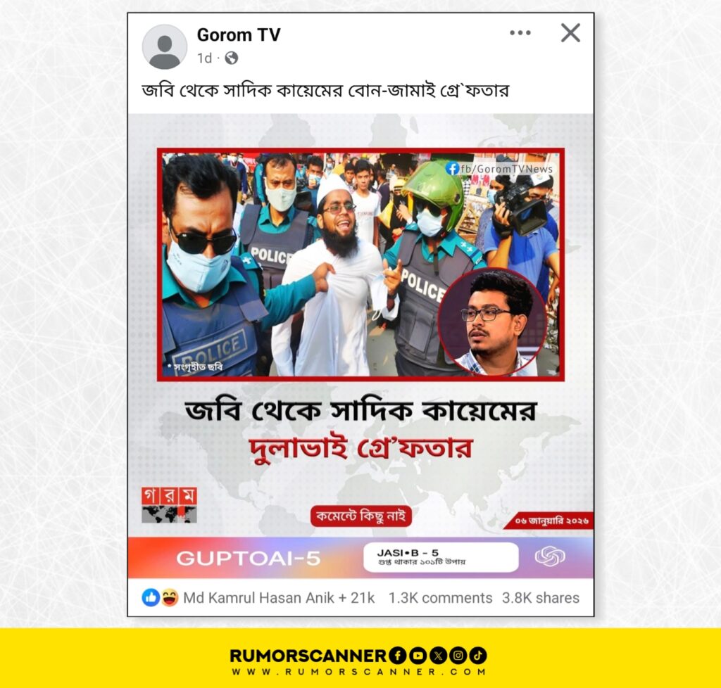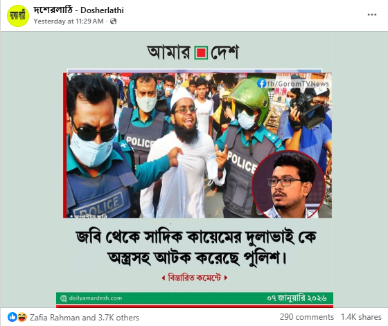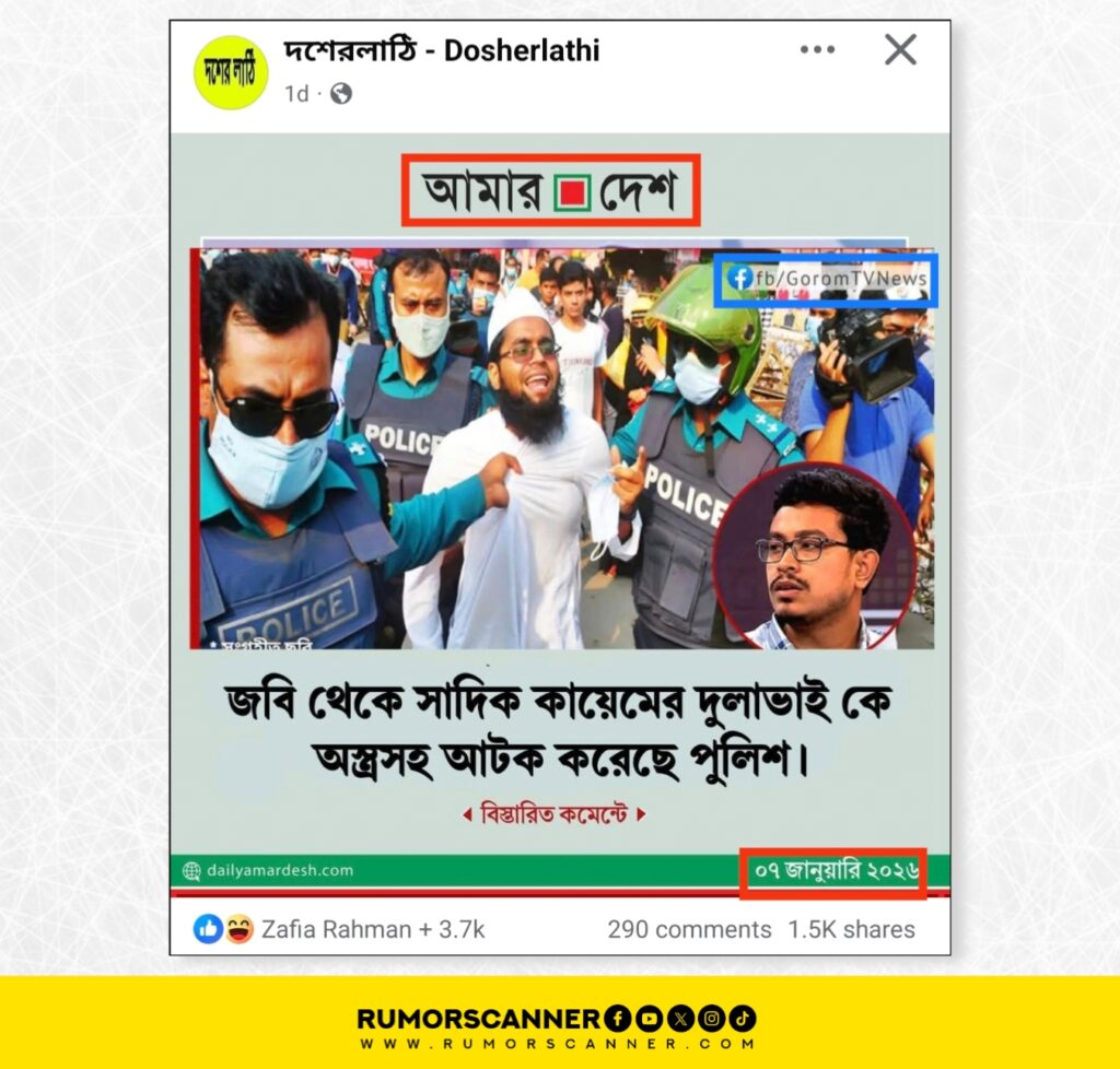 গতকাল (৬ জানুয়ারি) জগন্নাথ বিশ্ববিদ্যালয় কেন্দ্রীয় শিক্ষার্থী সংসদ (জকসু) নির্বাচন অনুষ্ঠিত হয়। এরই প্রেক্ষিতে, ‘জবি থেকে সাদিক কায়েমের দুলাভাই কে অস্ত্রসহ আটক করেছে পুলিশ।’ শিরোনামে আমার দেশের ডিজাইন সংবলিত একটি ফটোকার্ড সামাজিক যোগাযোগ মাধ্যমে প্রচার করা হয়েছে।