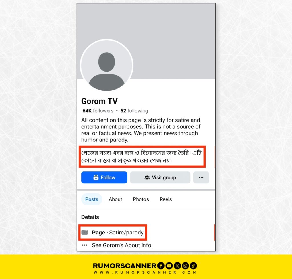 তারপর, ‘Gorom Tv’ নামক ফেসবুক পেজটি বিশ্লেষণ করে দেখা যায়, পেজটির বায়োতে উল্লেখ রয়েছে ‘যে এটি সার্কাজম পেজ’।