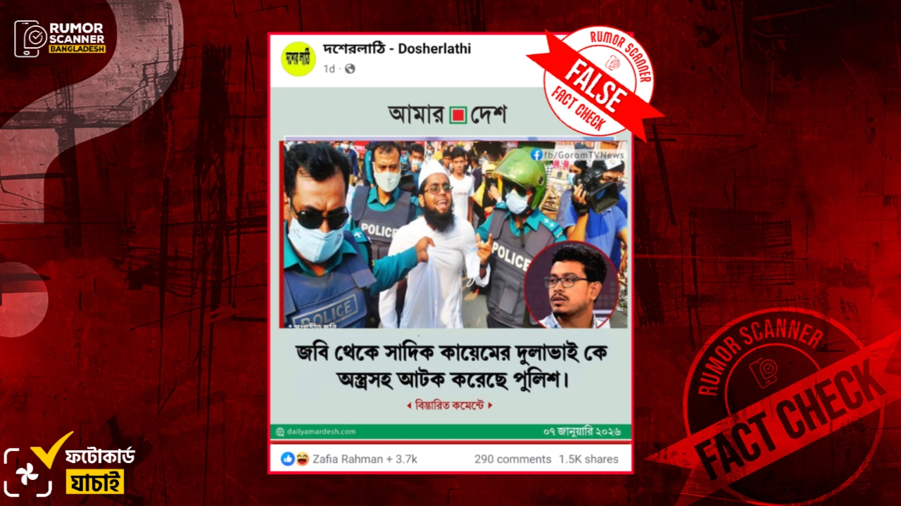সুতরাং, ভিন্ন ব্যক্তির পুরোনো ছবি যুক্ত করে ‘জবি থেকে সাদিক কায়েমের দুলাভাইকে অস্ত্রসহ আটক করেছে পুলিশ’ শীর্ষক দাবিতে আমার দেশের নামে প্রচারিত ফটোকার্ডটি ভুয়া।