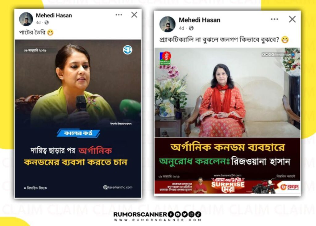 রিউমর স্ক্যানার টিমের অনুসন্ধানে জানা যায়, অর্গানিক কনডমের বিষয়ে পরিবেশ, বন ও জলবায়ু পরিবর্তন মন্ত্রণালয়ের উপদেষ্টা সৈয়দা রিজওয়ানা হাসানকে জড়িয়ে প্রচারিত ফটোকার্ডগুলো কালের কণ্ঠ ও বাংলাভিশন প্রকাশ করেনি। প্রকৃতপক্ষে, গণমাধ্যমগুলোর ফটোকার্ড ডিজাইন ডিজিটাল প্রযুক্তির সহায়তায় নকল করে আলোচিত দাবি সংবলিত ফটোকার্ডগুলো তৈরি করা হয়েছে।