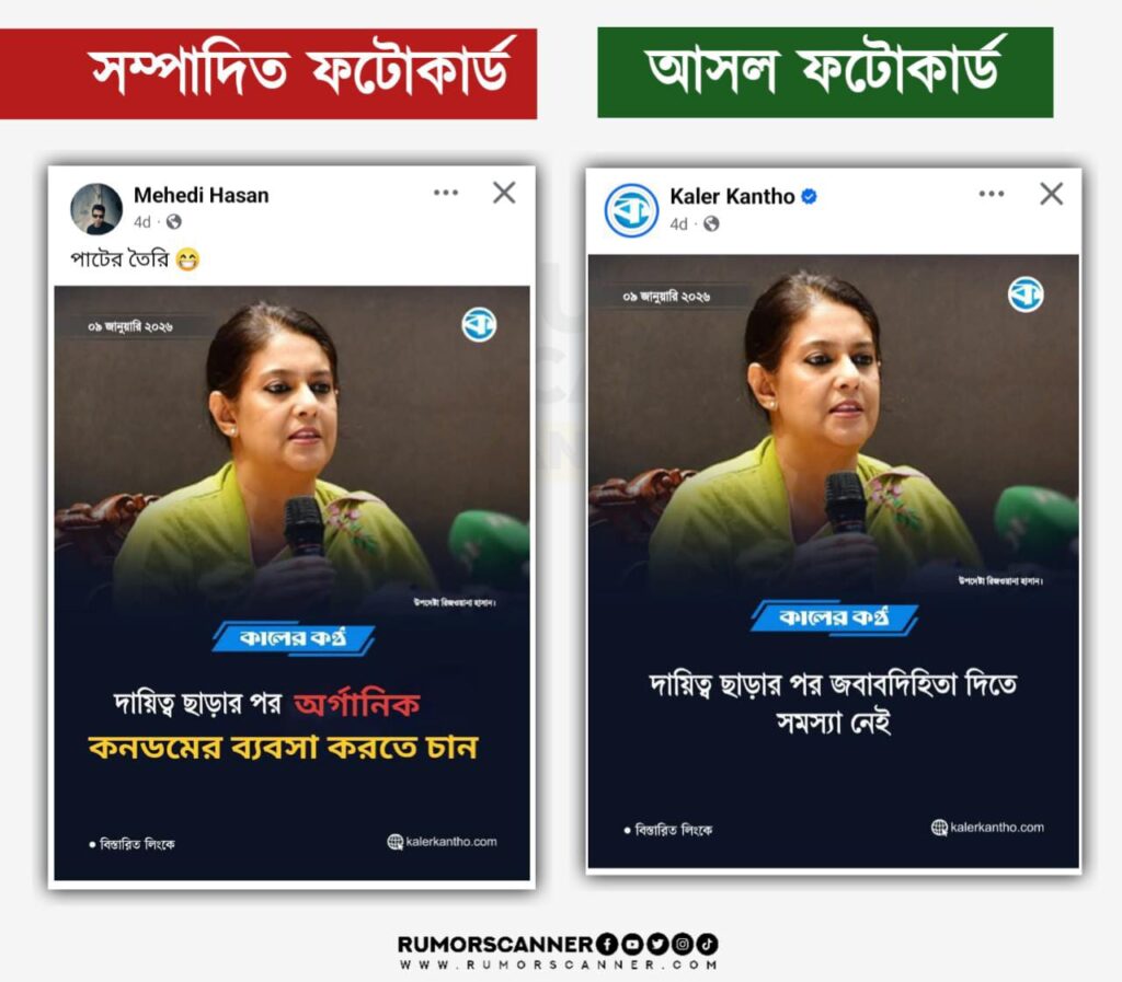 কালের কণ্ঠের নামে প্রচারিত ফটোকার্ডে দাবি করা হয়েছে, ‘দায়িত্ব ছাড়ার পর অর্গানিক কনডমের ব্যবসা করতে চান’।